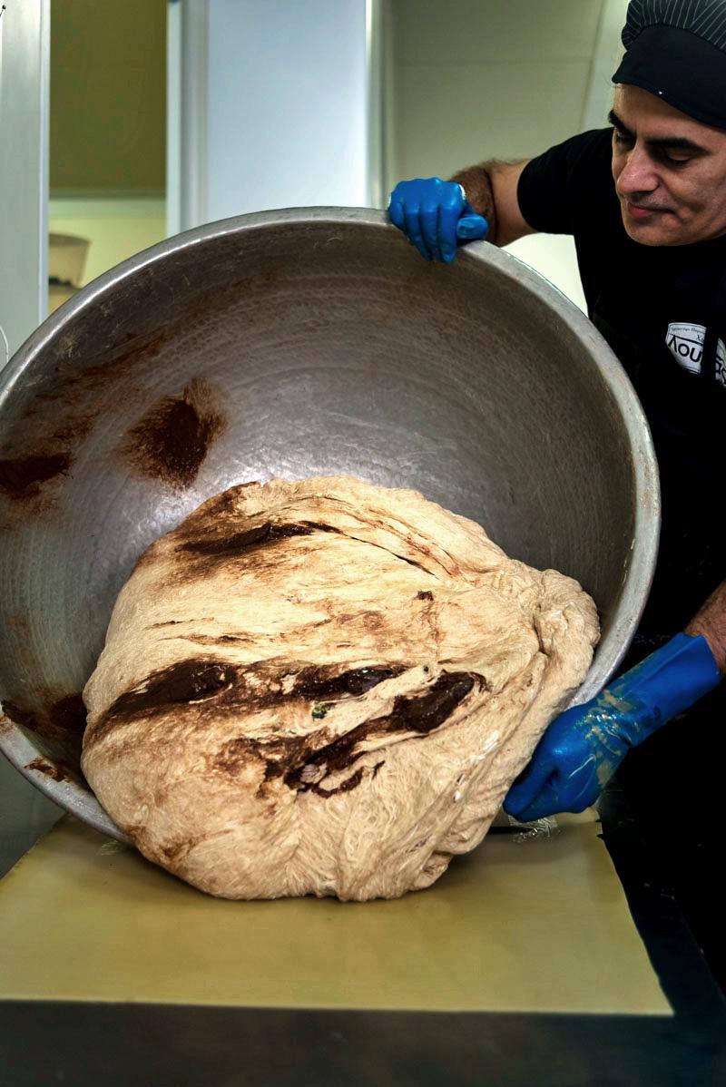 Νέος κύκλος ζύμης με τα χέρια. Αφράτεμα του υλικού και δημιουργία του μαγικού χαλβά που όλοι ξέρουμε. Είναι η στιγμή που το εργαστήριο μοσχοβολάει ταχίνι, που θέλεις να βουτήξεις σε αυτόν τον απίστευτο πολτό που βλέπεις μπροστά σου.