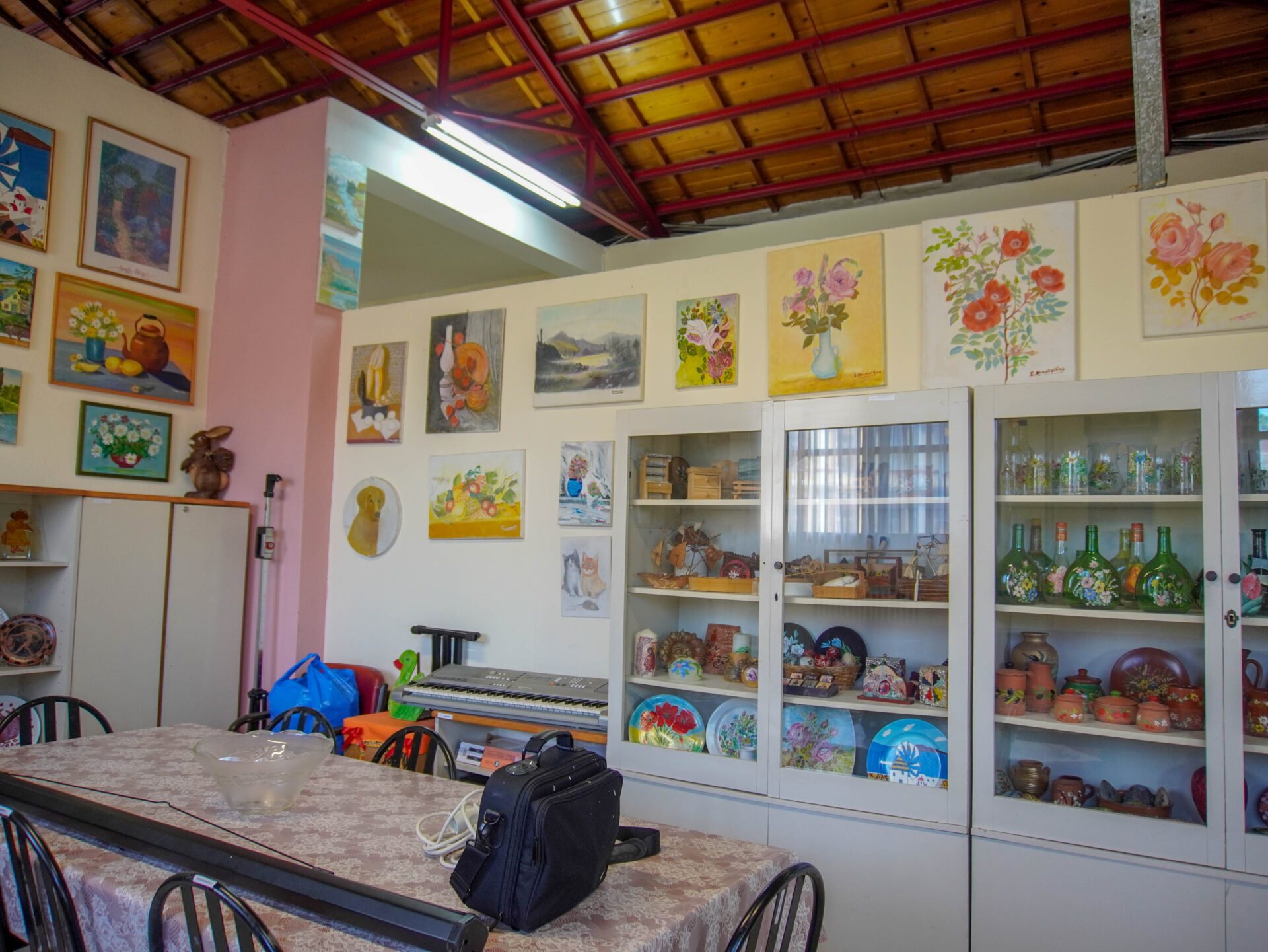 Η κυρία Τατιανή μας οδηγεί σε μια αίθουσα όπου εκτίθενται πανέμορφα ζωγραφικά έργα των μελών και άλλα χειροτεχνήματα.