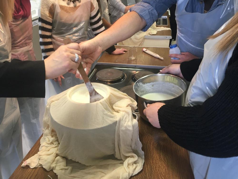 Προσθέτουμε στη κατσαρόλα πέντε λίτρα γάλα και το ανακατεύουμε συνεχώς μέχρι να φτάσει τη θερμοκρασία των 90-92 βαθμών Κελσίου. Εν συνεχεία, μόλις φτάσουμε στη επιθυμητή θερμοκρασία ρίχνουμε ένα ποτήρι μυλόξυδο ή χυμό λεμονιού. Ανακατεύουμε σιγά σιγά και σε λίγη ώρα δημιουργείται ένα πήγμα. Το αφήνουμε να στεγνώσει και το σερβίρουμε είτε με μέλι είτε με καρυκεύματα της αρεσκείας μας.