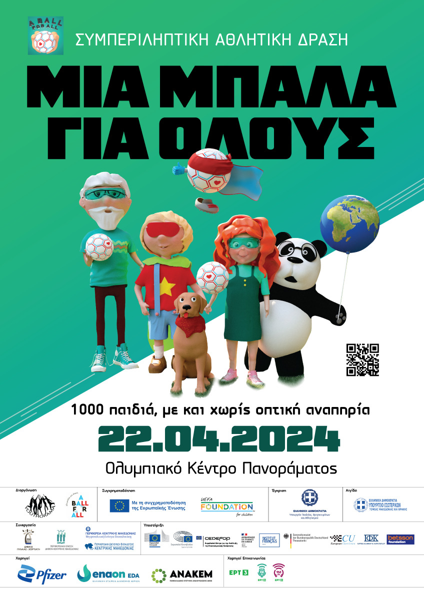 Η παγκόσμια καμπάνια «Μία μπάλα για όλους» έχει ξεκινήσει εδώ και 6 χρόνια από την Ελλάδα και κουδουνίζει σε 213 χώρες και περιοχές. Ο φορέας Όραμα Νέων Youthorama, υλοποιεί τον 1ο συμπεριληπτικό σχολικό διαγωνισμό, τη Δευτέρα 22 Απριλίου 2024 στο Ολυμπιακό Κέντρο Πανοράματος με τη συμμετοχή 1.000 παιδιών με και χωρίς οπτική αναπηρία. Θα λάβουν μέρος σχολεία της Κεντρικής Μακεδονίας όπου φοιτούν και παιδιά με οπτική αναπηρία και είναι η μεγαλύτερη συμπεριληπτική γιορτή! Θα υπάρχουν 20 εκπαιδευτικοί σταθμοί με τη βοήθεια επιστημονικών συνεργατών: