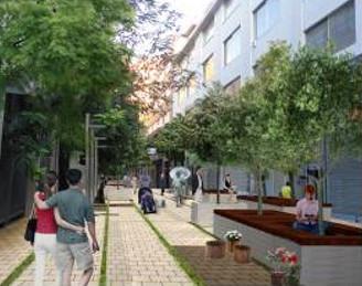 ε) κατασκευή νέων δαπεδοστρώσεων στα πεζοδρόμια και στην πλατεία διαχωρισμένων με τη μορφή λωρίδων σε σκληρές και μαλακές επιφάνειες ανάλογα με το είδος του υλικού επίστρωσης. Οι επιστρώσεις των γραμμικών λωρίδων γίνεται με ψυχρά υλικά (τσιμεντοκυβόλιθους 10χ20χ6 εκ) και των βασικών λωρίδων πλάτους 0.90μ. γίνονται κατά περίπτωση με υλικά όπως:i) τσιμεντοκυβόλιθους 10χ10χ6cm(σκληρή επιφάνεια),ii) διάτρητους τσιμεντοκυβόλιθους με χαμηλή βλάστηση (ενδιάμεση επιφάνεια), φυτεμένα παρτέρια(μαλακή επιφάνεια) και χυτό διακοσμητικό δάπεδο από μπετόν με βοτσαλωτή επιφάνεια(σκληρή επιφάνεια).