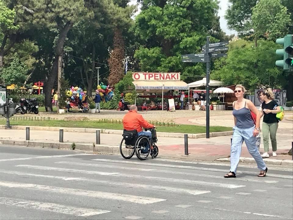 «Ντροπή! Μεσημέρι Σαββάτου. Τα τουριστικά λεωφορεία παρκαρισμένα σε διπλή σειρά (σε μια περίπτωση ακόμα και ΤΡΙΠΛΗ!) σε όλο το μήκος του δρόμου, από το Λευκό Πύργο μέχρι τις ομπρέλες. Η προσπάθεια και η αγωνία ενός ανθρώπου με κινητικά προβλήματα (αλλά και ενός ποδηλάτη, λίγα λεπτά αργότερα) να διασχίσουν το δρόμο αποτυπώνουν τη ντροπή και την ξεφτίλα μας. Υπάρχει σηματοδότης στο σημείο αυτό, όμως η ανασφάλεια που δημιουργεί ο όγκος των οχημάτων που εμποδίζουν την οπτική επαφή με τα αυτοκίνητα ήταν προφανής στις κινήσεις αυτού του ανθρώπου. Την καταλάβαινες στο συνεχές σκύψιμό του για να δει πίσω από τα λεωφορεία και στα μικρά μπρος-πίσω που έκανε με το καρότσι του. Άλλωστε, τα φανάρια …παραβιάζονται -ποιος δεν αισθάνεται την ανάγκη να ρίξει μια ματιά πριν διασχίσει το δρόμο; Πόσω μάλλον, όταν η κινητική αναπηρία τον καθιστά πιο ευάλωτο.