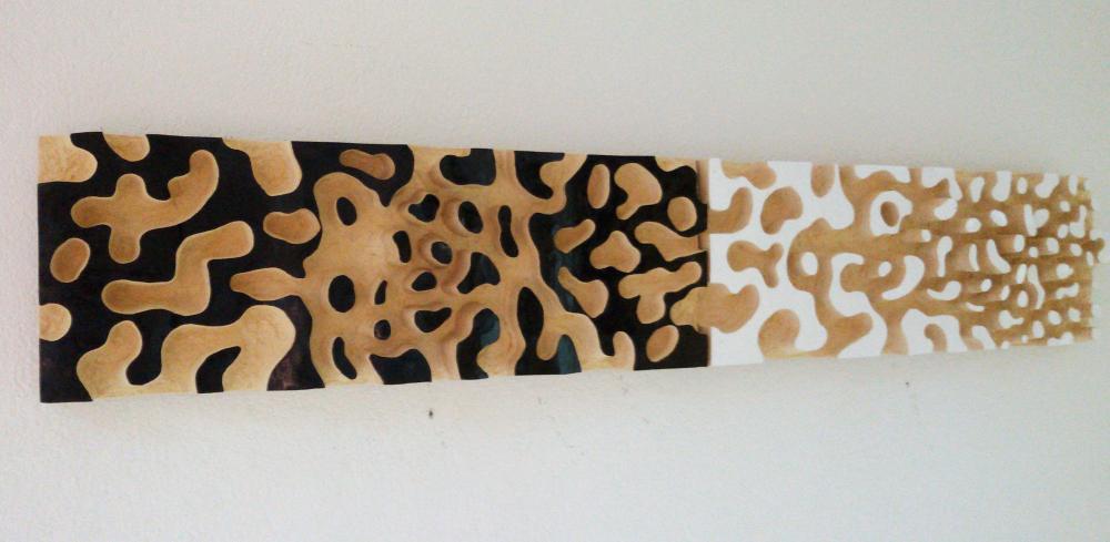 Έργα από ξύλο μαζί με ένα ζωγραφικό με λάδι σε ύφασμα, με τίτλο «ὓλη τόπος».