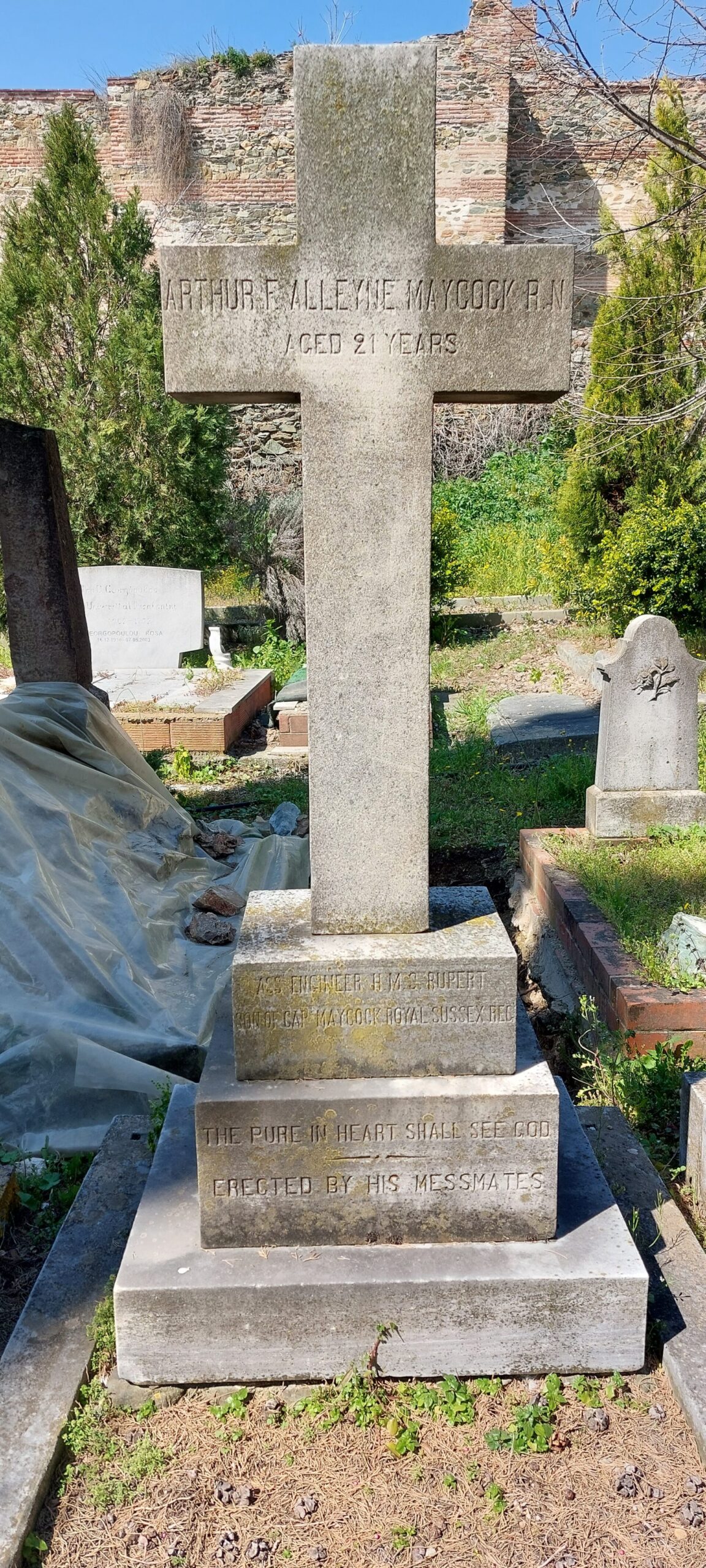 Arthur Frederick Alleyne Maycock γεννήθηκε στις 25.6.1880 στο Torquay, Torbay, Αγγλία, Ηνωμένο Βασίλειο και άρχισε να υπηρετεί στο Βασιλικό Ναυτικό στις 22.6.1901 ως δόκιμος βοηθός μηχανικός στο HMS Rupert, το οποίο είχε σταθμεύσει στη Γιβραλτά από το 1895 και στη συνέχεια στο Πορτ Σάιντ μέχρι τα τέλη Απριλίου 1902. Κατά τη διάρκεια αυτής της περιόδου πραγματοποίησε ταξίδια σε όλη την Ανατολική Μεσόγειο, μεταξύ των οποίων και στη Θεσσαλονίκη, όπου ο Maycock πέθανε από τυφοειδή πυρετό (ενδημικός πυρετός) στις 11 Φεβρουαρίου 1902. Οι σύντροφοί του έστησαν την ταφόπλακα.