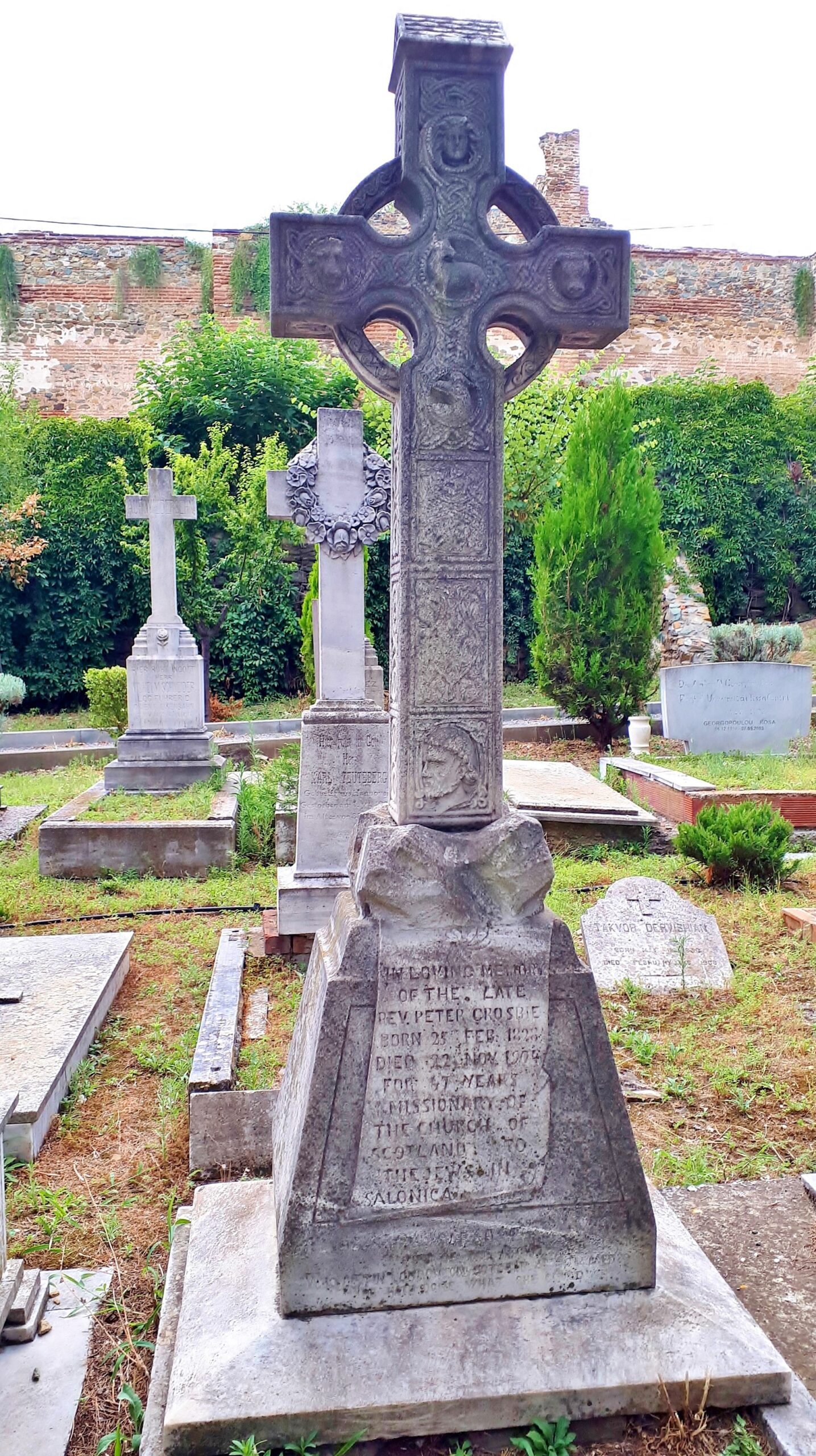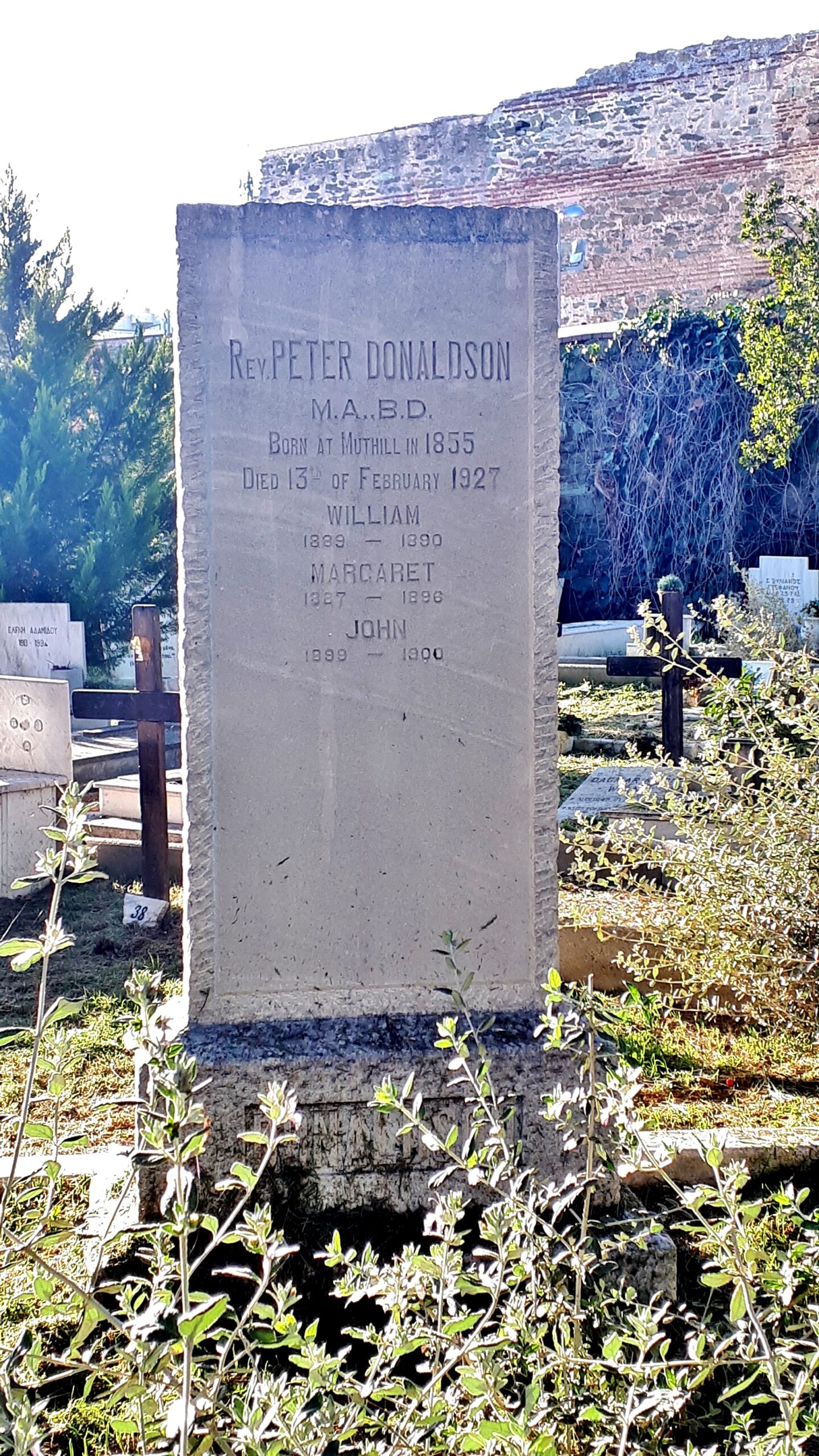 Ένας τρίτος, Άγγλος κληρικός που έχει ταφεί σε αυτό το νεκροταφείο είναι ο αιδεσιμότατος Peter Donaldson (1855 – 13.2.1927) Γεννήθηκε στο Muthill της Σκωτίας, σπούδασε στο Πανεπιστήμιο της Γλασκώβης και στάλθηκε ως “πρεσβυτεριανός ιεραπόστολος” στην Κωνσταντινούπολη το 1882. Μέσω της Αλεξάνδρειας και της Σμύρνης, όπου γνώρισε τη μέλλουσα σύζυγό του, ήρθε στη Θεσσαλονίκη περίπου το 1886. Δεν δραστηριοποιήθηκε στην “αποστολή για να προσηλυτίσει τους Εβραίους”, αλλά ίδρυσε ένα σχολείο. Από το 1903 εργάστηκε επίσης ως καθηγητής αγγλικών στη Γερμανική Σχολή, στην οποία φοιτούσαν και μερικά από τα 10 παιδιά του. Η κόρη του Κουίνι ζούσε στην Ελλάδα τουλάχιστον μέχρι το 1945.