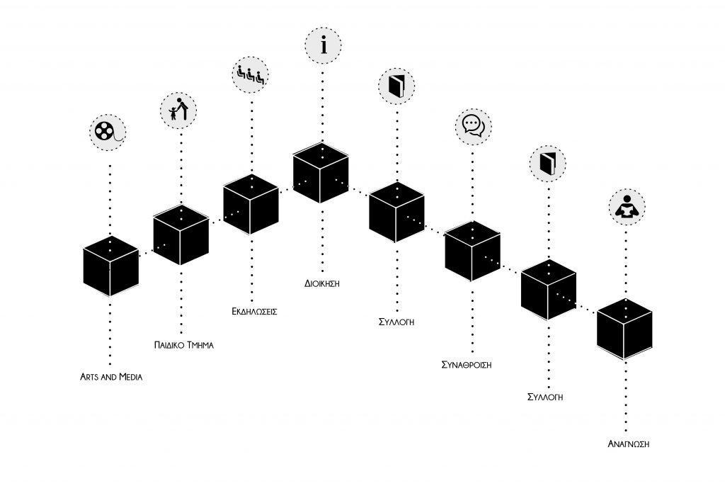 Τέλος, επειδή θεωρούμε σημαντικό η βιβλιοθήκη να απευθύνεται σε πολλούς διαφορετικούς χρήστες και να στεγάζει πολλές εναλλακτικές δραστηριότητες, προτείνουμε στο σενάριο μας χρήσεις όπως παιδικό τμήμα, τμήμα «arts & media», τμήμα κηπουρικής, τμήμα κινηματογράφου και θεάτρου και χώρους εκθέσεων. Σημαντικό στοιχείο της σύνθεσης είναι η πλατεία που δημιουργείται μπροστά από την βιβλιοθήκη και προσφέρει επιπλέον υπαίθριες δραστηριότητες τόσο στον περίπατο της νέας παραλίας όσο και στην βιβλιοθήκη, όπως υπαίθρια αναγνωστήρια.