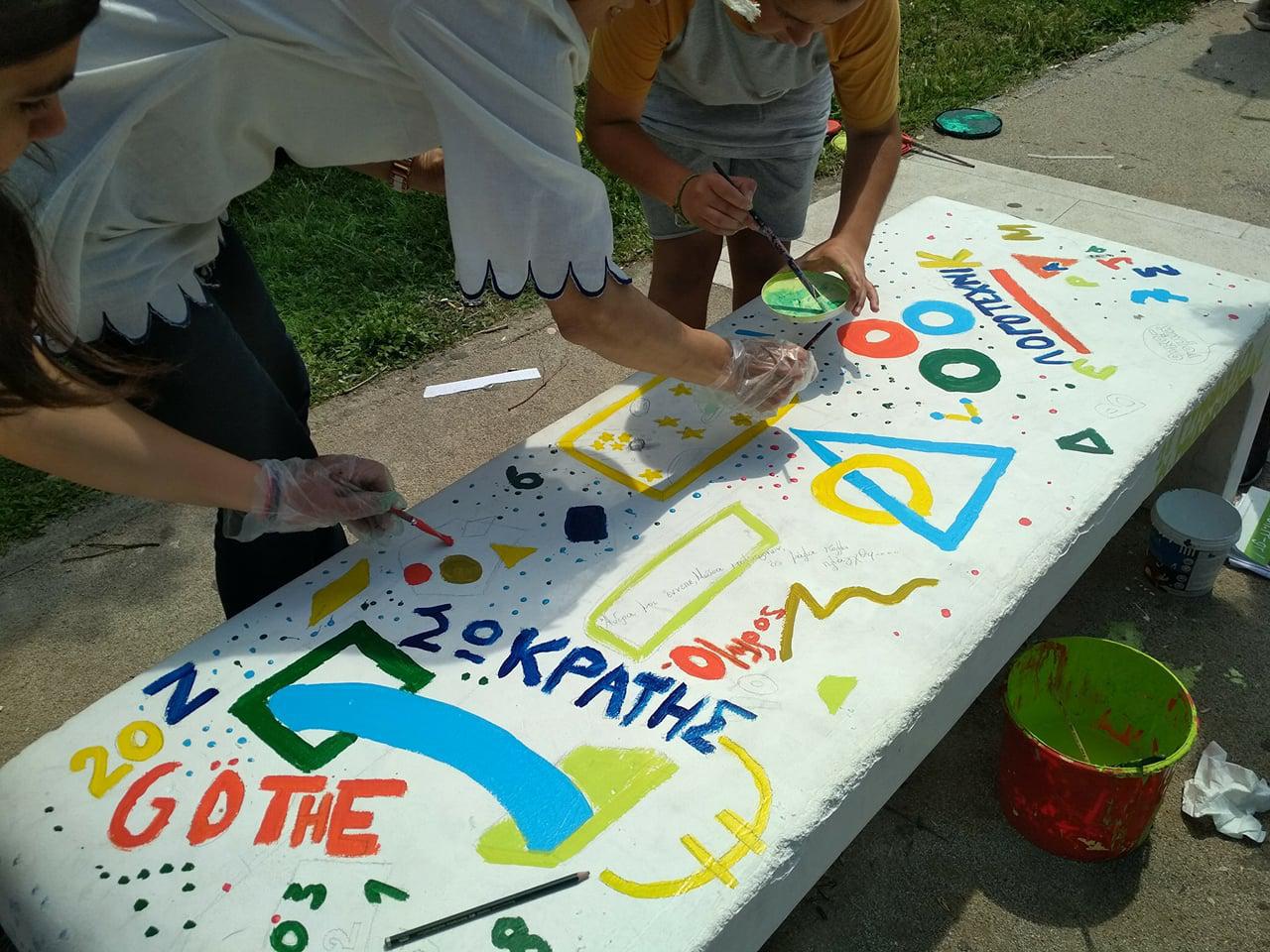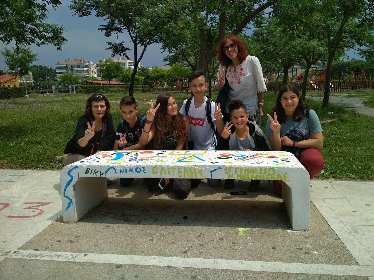 Περισσότεροι από 100 μαθητές και εκπαιδευτικοί από έξι Γυμνάσια του δήμου Θερμαϊκού συγκεντρώθηκαν χθες στο πάρκο- παιδική χαρά της Περαίας (επί της οδού Ανθέων) και ζωγράφισαν παγκάκια και κάδους απορριμμάτων.
