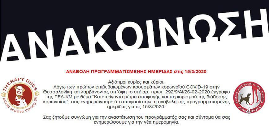 Λόγω των πρώτων επιβεβαιωμένων κρουσμάτων κορωνοϊού COVID-19 στην Θεσσαλονίκη και λαμβάνοντας υπ΄όψη το υπ’ αρ. πρωτ. 292/9/ΑΙ/26-02-2020 έγγραφο της ΠΕΔ-ΚΜ με θέμα “Κατεπείγοντα μέτρα αποφυγής και περιορισμού της διάδοσης κορωνοϊου”, αποφασίστηκε η αναβολή προγραμματισμένης ημερίδας για τις 15/3/2020.