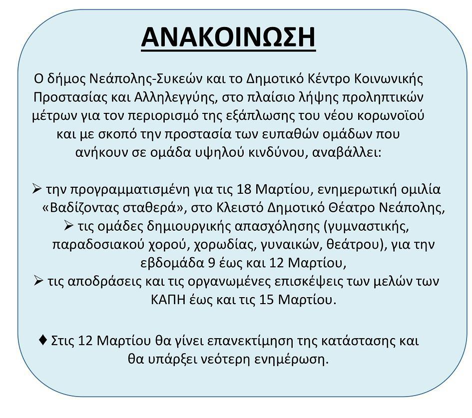 Αναβολή εκδηλώσεων στον Δήμο Νεάπολης-Συκεών