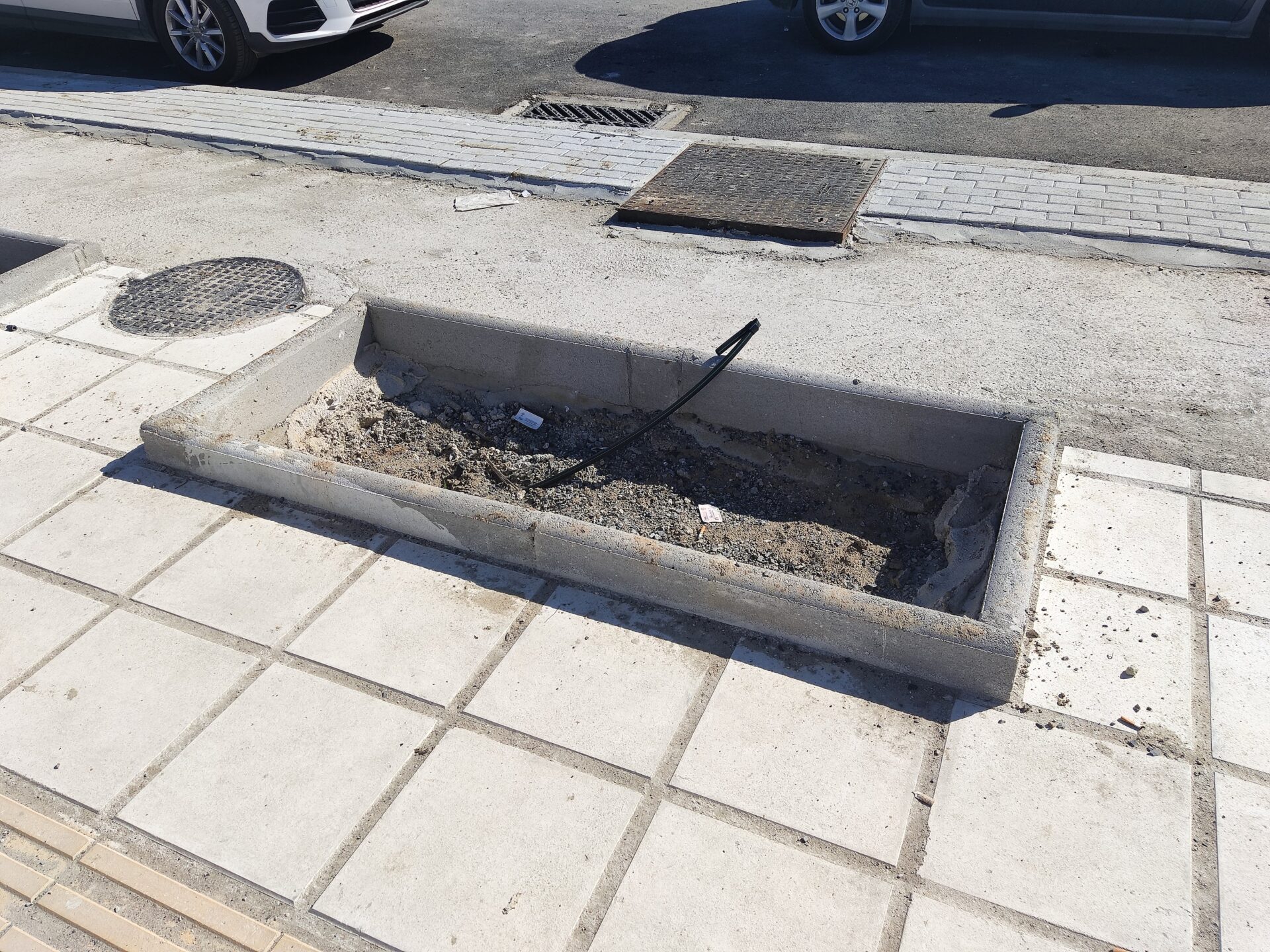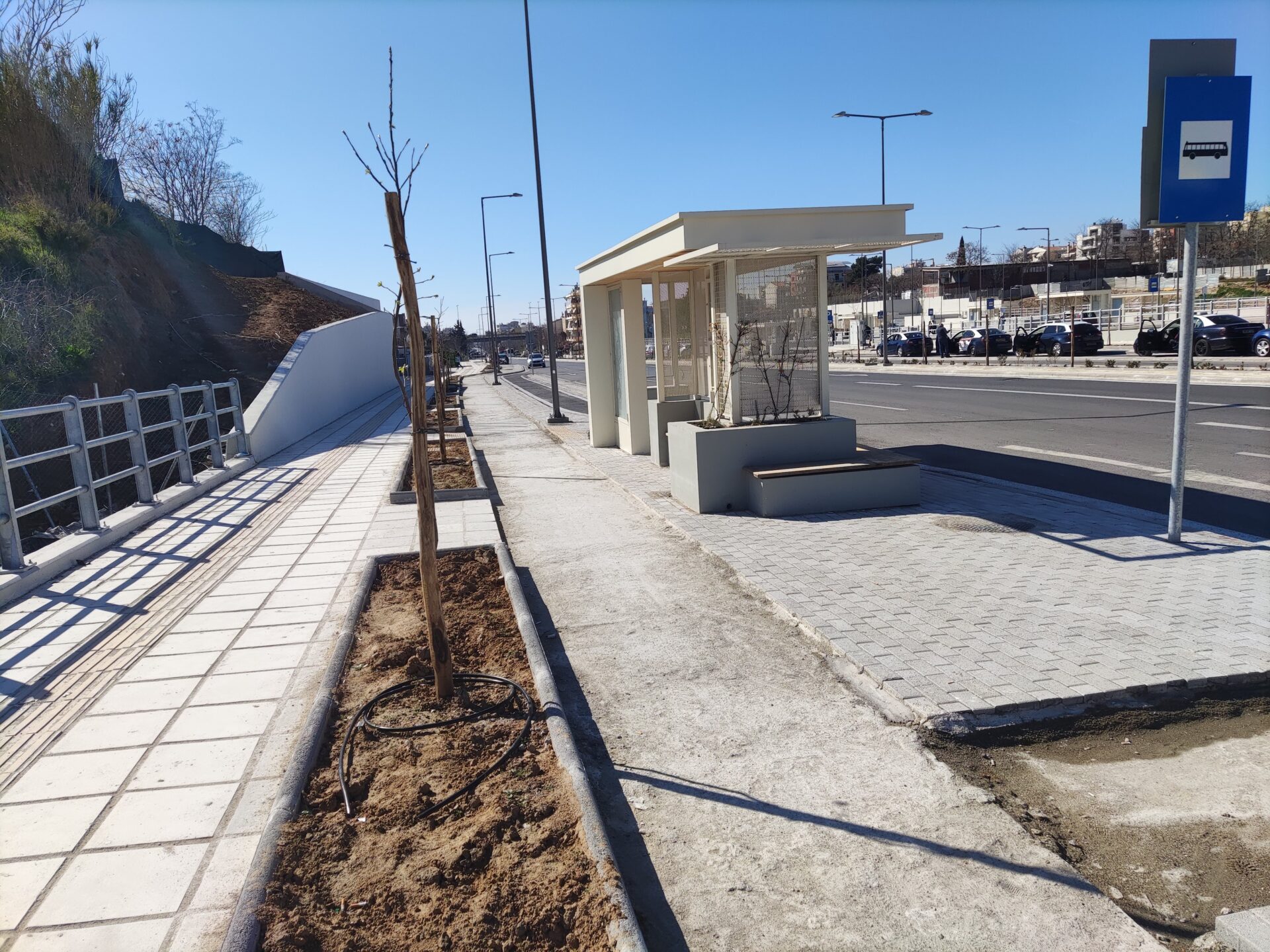 Λίγο πιο πάνω, στην κυρίως περιοχή του σταθμού μετεπιβίβασης, βλέπει κανείς άδεια παρτέρια και σημεία όπου δεν έχουν ακόμα μπει πλάκες πεζοδρομίου, ενώ υπάρχει και ένας στενός διάδρομος, που μάλλον προορίζεται για ποδηλατόδρομο και δεν έχει ακόμα στρωθεί με ειδικό υλικό.