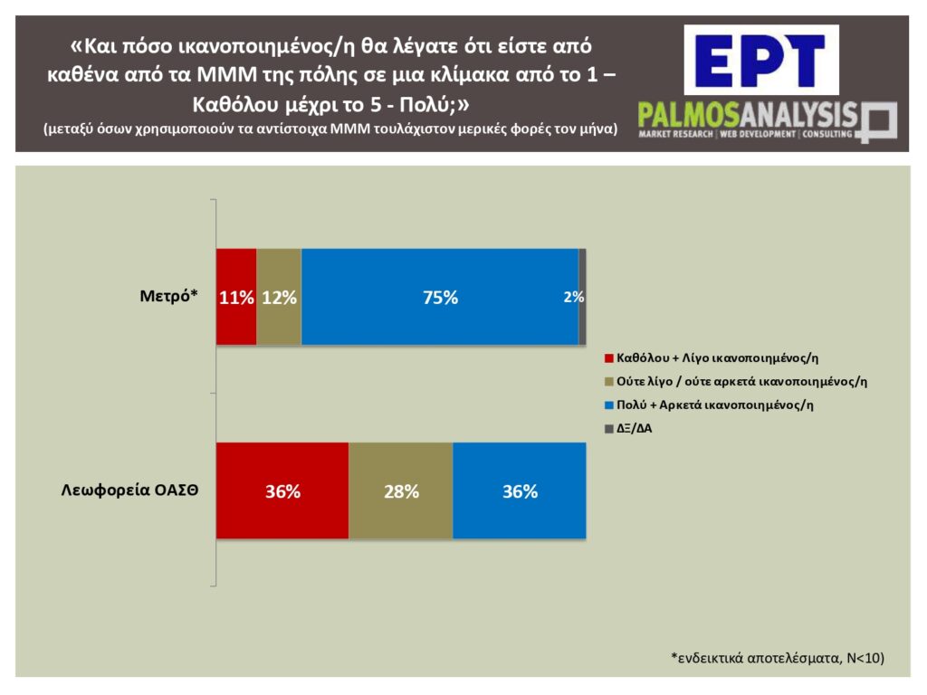 - Υψηλή ικανοποίηση προκύπτει για το Μετρό, καθώς δηλώνουν «Πολύ» ή «Αρκετά» ικανοποιημένοι το 75% όσων το χρησιμοποιούν τουλάχιστον μερικές φορές τον μήνα. Παράλληλα, το 85% των χρηστών του Μετρό θεωρούν ότι η λειτουργία του συμβάλει «Θετικά» ή «Μάλλον θετικά» στην πραγματοποίηση των μετακινήσεών τους εντός της πόλης. Ουδέτερο ισοζύγιο ικανοποίησης προκύπτει για τους χρήστες Λεωφορείων, καθώς το 36% όσων τα χρησιμοποιούν τουλάχιστον μερικές φορές τον μήνα δηλώνουν «Πολύ» ή «Αρκετά» ικανοποιημένοι, όσοι ακριβώς δηλώνουν «Λίγο» ή «Καθόλου» ικανοποιημένοι.