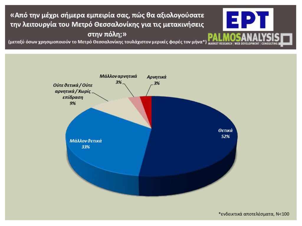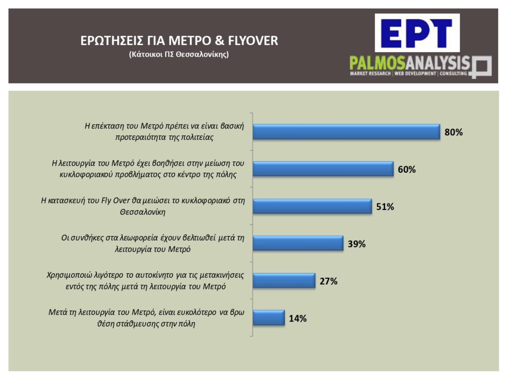 - 8 στους 10 κατοίκους του ΠΣ Θεσσαλονίκης (80%) θεωρούν ότι η επέκταση του Μετρό πρέπει να είναι βασική προτεραιότητα της Πολιτείας. Το 60% αναφέρουν ότι η λειτουργία του Μετρό έχει βοηθήσει στη μείωση του κυκλοφοριακού προβλήματος στο κέντρο της Θεσσαλονίκης.
