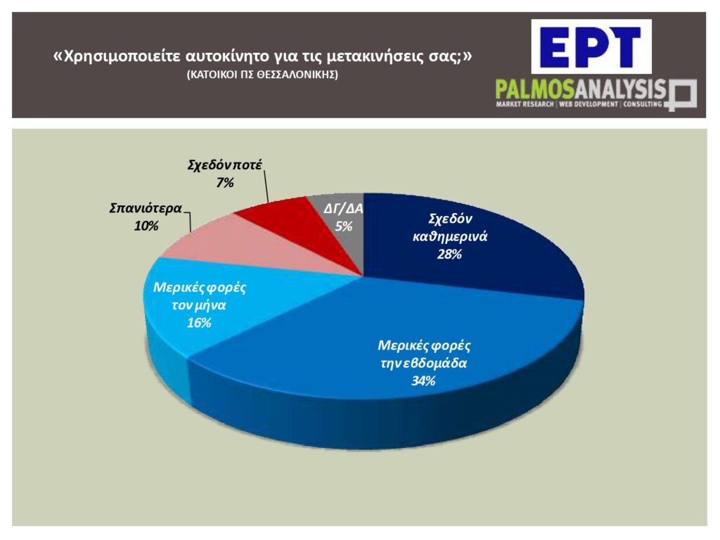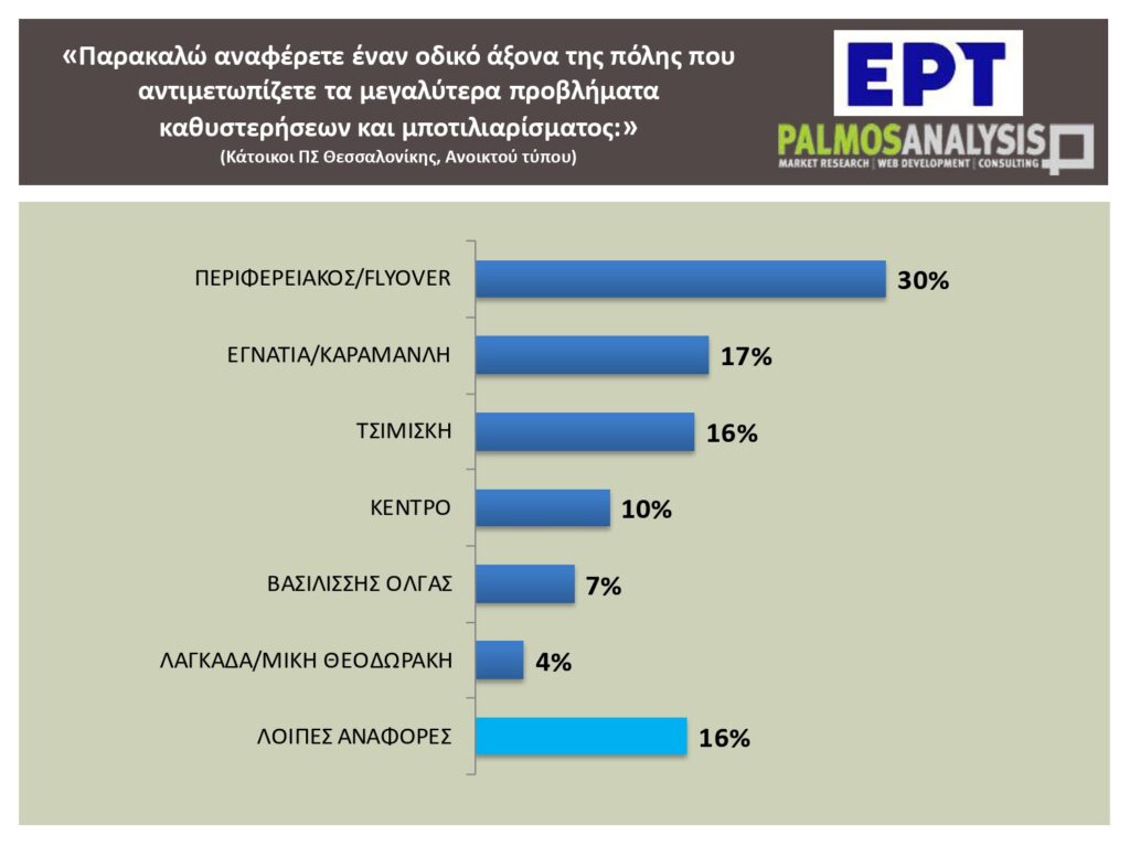 - Σχεδόν 3 στους 10 κατοίκους του ΠΣ Θεσσαλονίκης (28%) χρησιμοποιούν ΙΧ αυτοκίνητο καθημερινά για τις μετακινήσεις τους. Ο Περιφερειακός αναδεικνύεται ως ο πιο προβληματικός οδικός άξονας στην Θεσσαλονίκη, από πλευράς καθυστερήσεων και μποτιλιαρίσματος, καθώς αναφέρεται από το 30% όσων απάντησαν στο συγκεκριμένο ερώτημα.