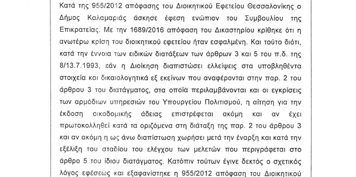 Αντιδρώντας ο δήμος Καλαμαριάς, κατέθεσε έφεση και οι υποθέσεις έφτασαν στο Συμβούλιο της Επικράτειας, το οποίο εξέδωσε τις αποφάσεις 1688/2016 και 1689/2016, που επί λέξει, «εξαφάνισαν» την απόφαση 955/2012 του Διοικητικού Εφετείου.