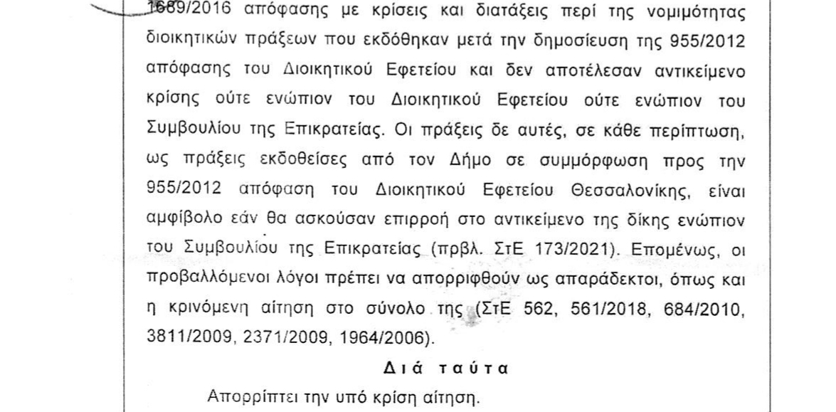 Πρόκειται για τις αποφάσεις 2040/2022 και 2041/2022, που αφορούν δύο παραλιακά οικόπεδα στο Καραμπουρνάκι, που ανήκουν σε ιδιώτες, τα οποία, ο δήμος Καλαμαριάς και η τοπική κοινωνία διεκδικούν ως κοινόχρηστα.