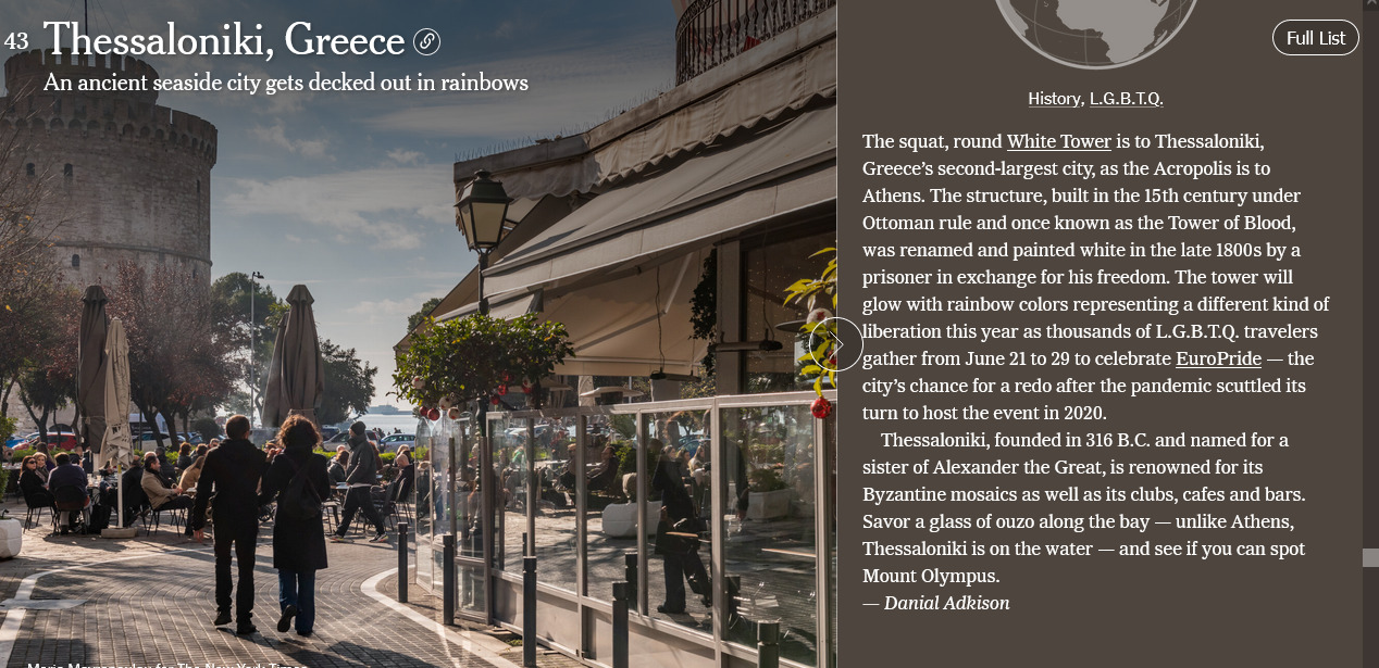 Η Θεσσαλονίκη συγκαταλέγεται στη λίστα με 52 ταξιδιωτικούς προορισμούς που πρέπει κάποιος να επισκεφτεί το 2024, με ιδιαίτερη αναφορά να γίνεται στο επικείμενο EuroPride