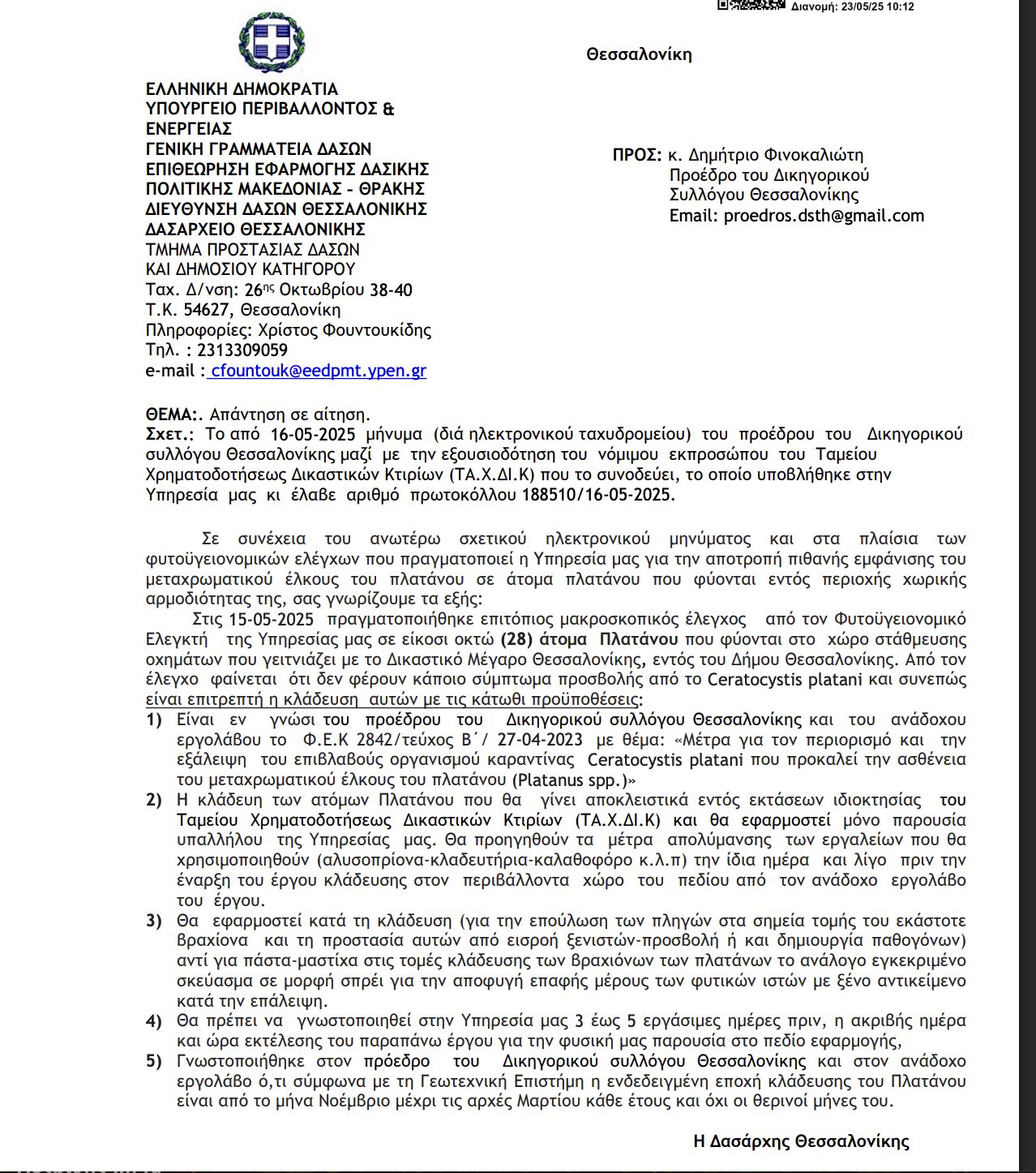 Με το έγγραφο που παρουσιάζουμε σήμερα γνωστοποιήθηκε στον πρόεδρο του Δικηγορικού συλλόγου Θεσσαλονίκης και στον ανάδοχο εργολάβο, ενημερώθηκαν πώς διαπιστώθηκε κατόπιν μακροσκοπικού ελέγχου ότι τα εν λόγω πλατάνια δεν παρουσιάζουν συμπτώματα προσβολής της ασθένειας του μεταχρωματικού έλκους οπότε και είναι δυνατή η κλάδευσή τους υπό όρους και προϋποθέσεις, τι σύμφωνα με τη Γεωτεχνική Επιστήμη η ενδεδειγμένη εποχή κλάδευσης του Πλατάνου είναι από το μήνα Νοέμβριο μέχρι τις αρχές Μαρτίου κάθε έτους και όχι οι θερινοί μήνες του.