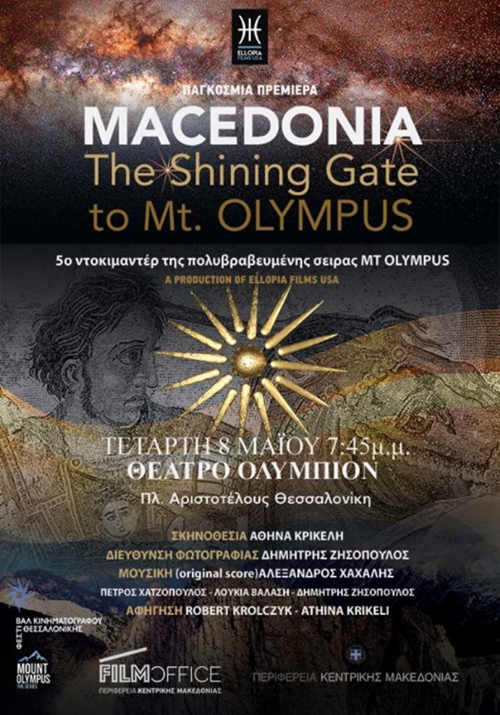 Υπό την αιγίδα του Film Office της Περιφέρειας Κεντρικής Μακεδονίας και την υποστήριξη του Φεστιβάλ Κινηματογράφου Θεσσαλονίκης πραγματοποιείται η παγκόσμια πρώτη προβολή του ντοκιμαντέρ «Μακεδονία, η λαμπερή πύλη του Ολύμπου» την Τετάρτη 8 Μαΐου 2019, στον κινηματογράφο Ολύμπιον στη Θεσσαλονίκη, στις 19.45.