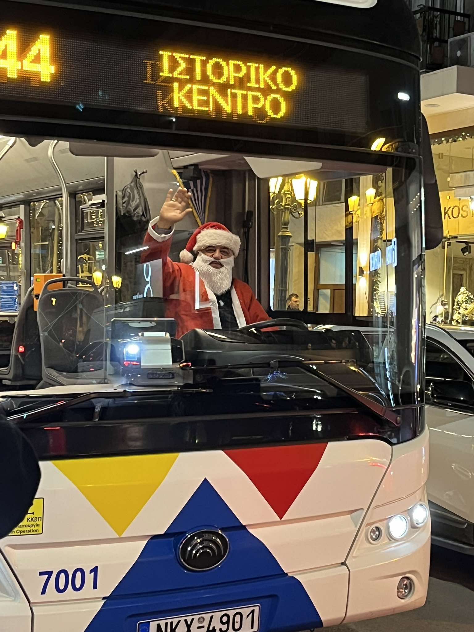 Φορώντας τη χαρακτηριστική κόκκινη στολή και τη γνώριμη άσπρη γενειάδα, ο οδηγός του λεωφορείου μεταμορφώθηκε σε Άγιο Βασίλη, χαρίζοντας χαμόγελα σε επιβάτες και πεζούς.