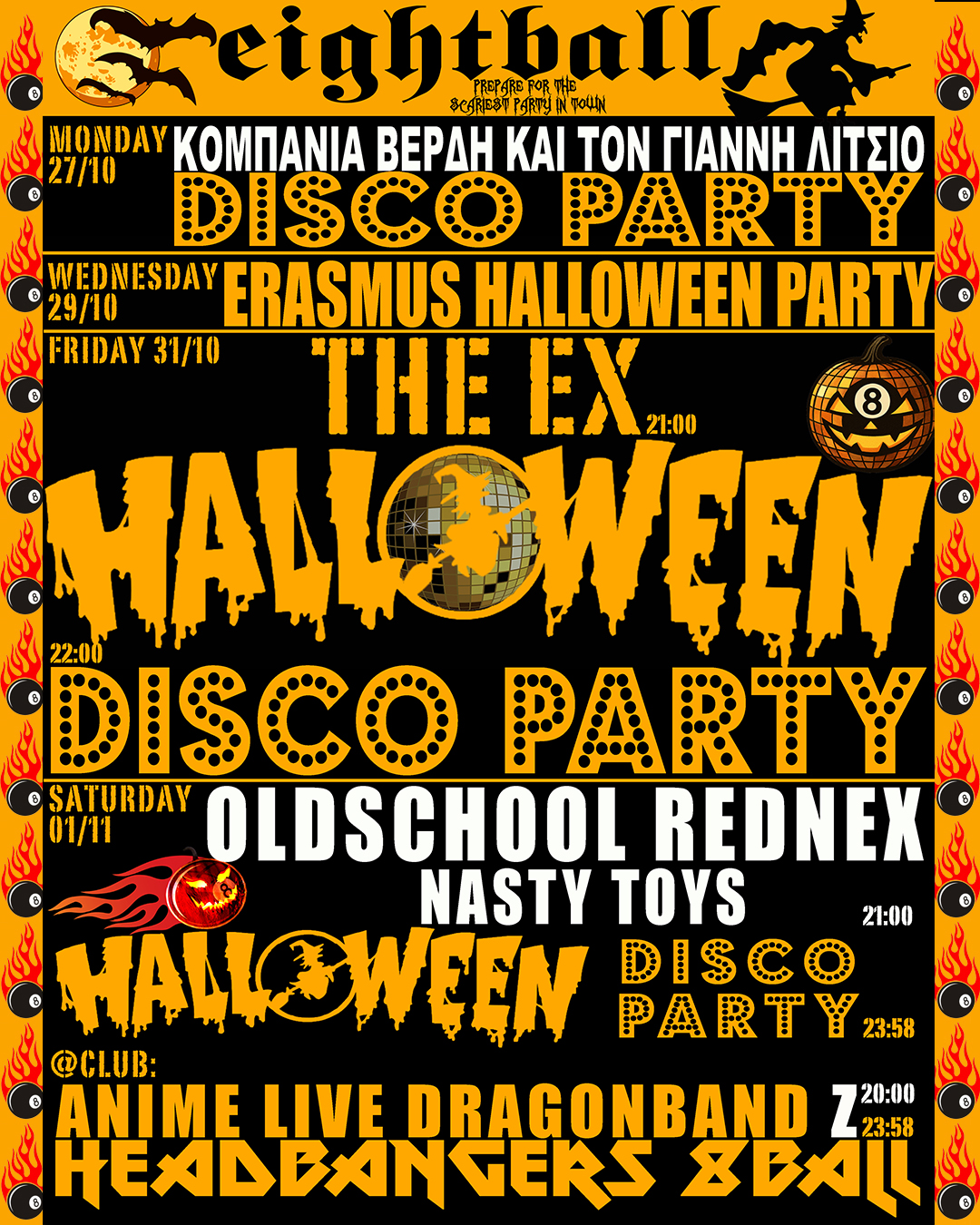 FRIDAY 31/10 @live stage ΤΗΕ EΧ Με πάνω από τέσσερις δεκαετίες αδιάκοπης πορείας, οι The Ex επιστρέφουν στην Ελλάδα που υπόσχονται ωμή ενέργεια, ένταση και αγνό punk rock,.Πιστοί στο DIY κουλτούρας, μετατρέπουν κάθε live σε ενα punk rock celebration! 21:00 22-27€ HALLOWEEN DISCO PARTY 80s/90s/00s/pop/party anthems/disco/RNB/Eurovision/Hip Hop 23:45 – 8€ Beer @club: HALLOWEEN DISCO PARTY 22:00 – 10 Beer€ Saturday 01/11 @live stage Oldschool Rednex – Νasty Toys Οι OLDSCHOOL REDNEX επιστρέφουν παρέα με τους NASTY TOYS στο eightball Live Stage στη Θεσσαλονίκη, σε μια Halloween ατμόσφαιρα γεμάτη punk ‘n’ roll ενέργεια. Ελάτε μεταμφιεσμένοι ή όχι — το μόνο που χρειάζεται είναι μια spooky rock ‘n’ roll διάθεση.Halloween party από την Ένωση Κωφών Βορείου Ελλάδας