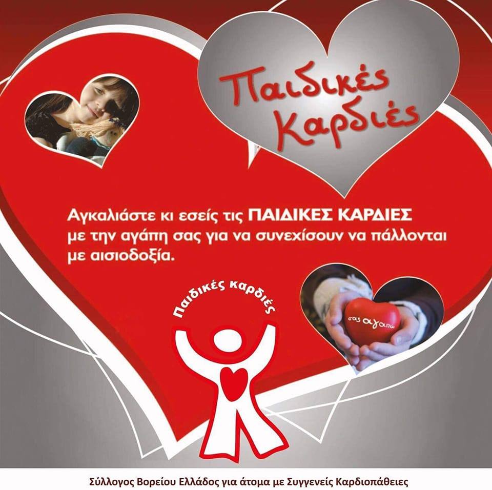 Χριστουγεννιάτικο μπαζάρ για άτομα με Συγγενείς Καρδιοπάθειες «Παιδικές Καρδιές» διοργανώνει ο Σύλλογος Βορείου Ελλάδος και ο πρότυπος παιδικός σταθμός Νέα Αγωγή την Κυριακή 30 Νοεμβρίου στους χώρους του Βρεφονηπιακού από τις 10.00 το πρωί έως και τις 16.00, στην οδό Σταθμού Μιαούλη 1, στη Καλαμαριά