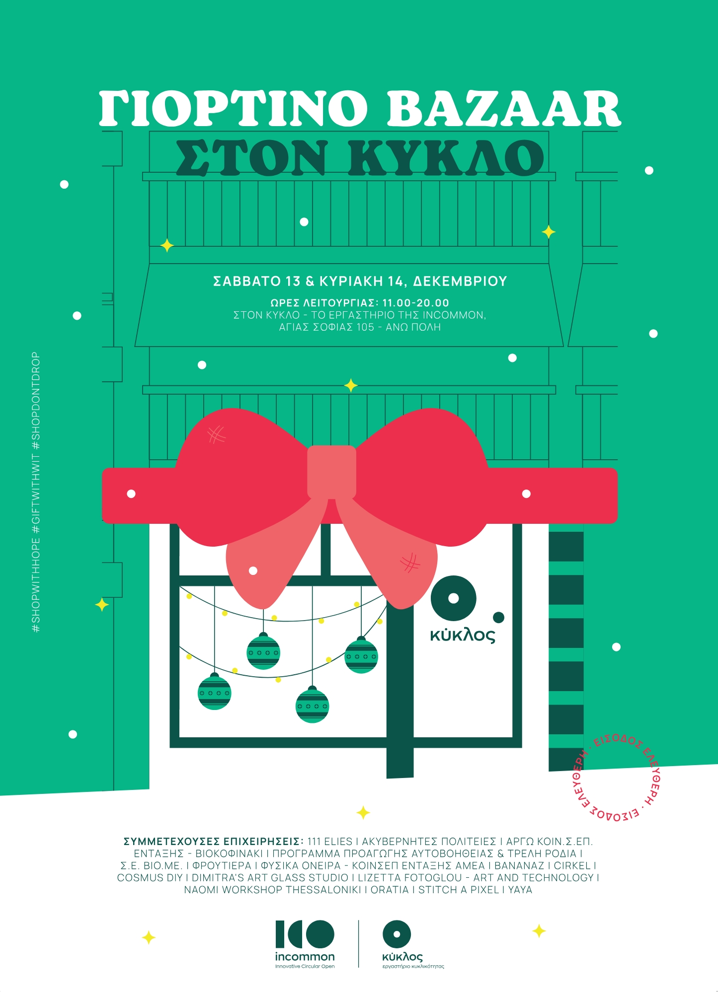 Στο Γιορτινό Bazaar του Κύκλου συμμετέχουν: 111 elies, Ακυβέρνητες Πολιτείες, ΑΡΓΩ ΚΟΙΝ.Σ.ΕΠ. Ένταξης – ΒΙΟκοφινάκι, Πρόγραμμα Προαγωγής Αυτοβοήθειας & Τρελή Ροδιά, Σ.Ε. ΒΙΟ.ΜΕ, Φρουτιέρα, Φυσικα ονειρα – ΚοινΣΕπ ενταξης ΑΜΕΑ, Bananaz, Cirkel, COSMUS DIY, Dimitra’s Art Glass Studio, Lizetta Fotoglou – Art and Technology, NAOMI Workshop Thessaloniki, Oratia, Stitch a pixel, Yaya