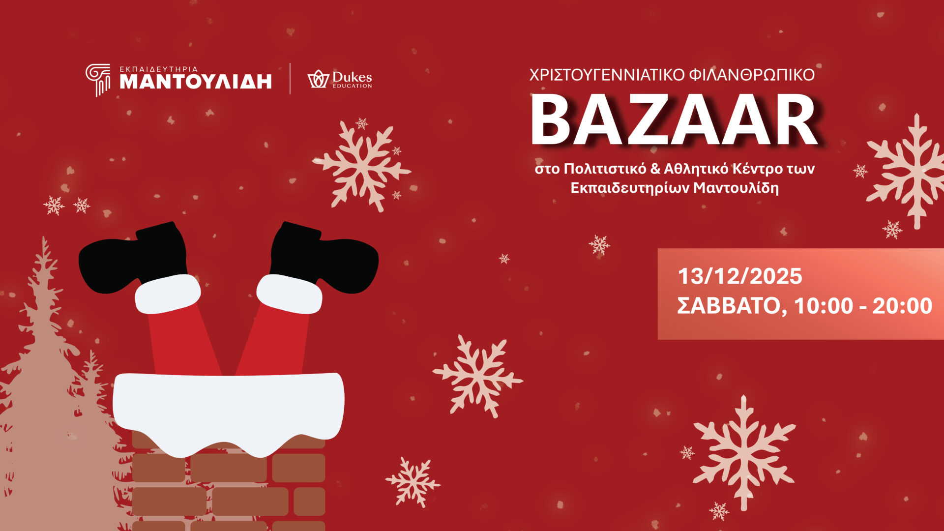 Tα Εκπαιδευτήρια Μαντουλίδη διοργανώνουν Χριστουγεννιάτικο Φιλανθρωπικό Bazaar, το Σάββατο, 13 Δεκεμβρίου 2025, από τις 10:00 το πρωί έως τις 08:00 το βράδυ, στο Πολιτιστικό και Αθλητικό Κέντρο των Εκπαιδευτηρίων, στις εγκαταστάσεις του Γυμνασίου–Λυκείου (12ο χλμ. Ε.Ο. Θεσ/νίκης – Ν. Μουδανιών).