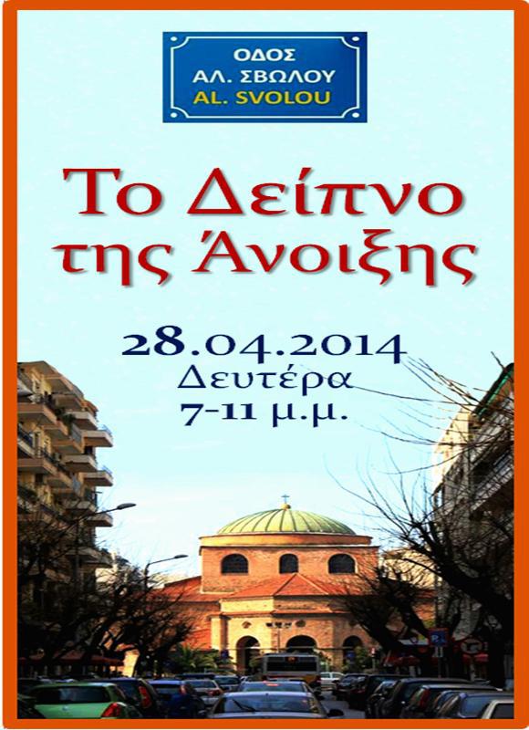 Το “Δείπνο” προσδιορίστηκε για τη Δευτέρα 28 Απριλίου, αμέσως μετά την Κυριακή του Θωμά, και το μενού του διαρκώς εμπλουτίζεται: τα εστιατόρια της περιοχής ετοιμάζουν τις σπεσιαλιτέ τους, νοικοκυρές και μαγείρισσες θα βάλουν πρόσθετες κατσαρόλες, ενώ οι κάτοικοι της Σβώλου, από την οδό Αγγελάκη μέχρι την πλατεία Ιπποδρομίου, θα κατέβουν από τα διαμερίσματα στα πεζοδρόμια με τα δικά τους φαγητά. Τα μπαρ και οι καφετερίες, σε αυτό το τμήμα της οδού, συνεισφέρουν με ποτά, κρασί, ρακόμελο και μπύρες σε μια πρωτόγνωρη συμμαχία καταστηματαρχών και κατοίκων.