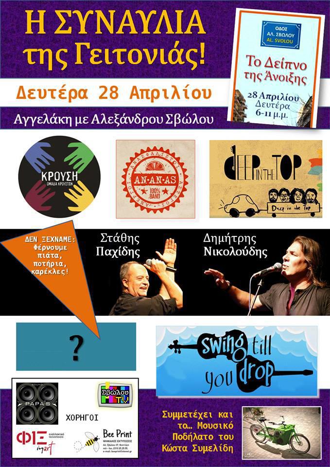 Ενώ η “Σβώλου TV” ετοίμαζε το πρώτο της επεισόδιο, μια φωτογραφία από ένα δείπνο σε ένα σοκάκι της Βαρκελώνης προκάλεσε έναν δεύτερο γύρο ενδιαφέροντος. Στην πρωτεύουσα της Καταλονίας υπάρχει αυτή η παράδοση: στήνουν ένα τραπέζι κι εκεί οι γειτόνοι συνυπάρχουν, συζητούν, διασκεδάζουν. Στο ερώτημα αν μεταφέρεται αυτή η πρωτοβουλία στη Θεσσαλονίκη, ακολούθησε νέος καταιγισμός απαντήσεων: “Γίνεται και στη Σιένα”, “Στην Πυλαία οργανώσαμε για δυο χρονιές ένα γεύμα γειτόνων”, “Στην Ελβετία τα οργανώνουν στα χωριά”, “Στο Καλαμπάκι έχουμε το Κουρμπάνι”!