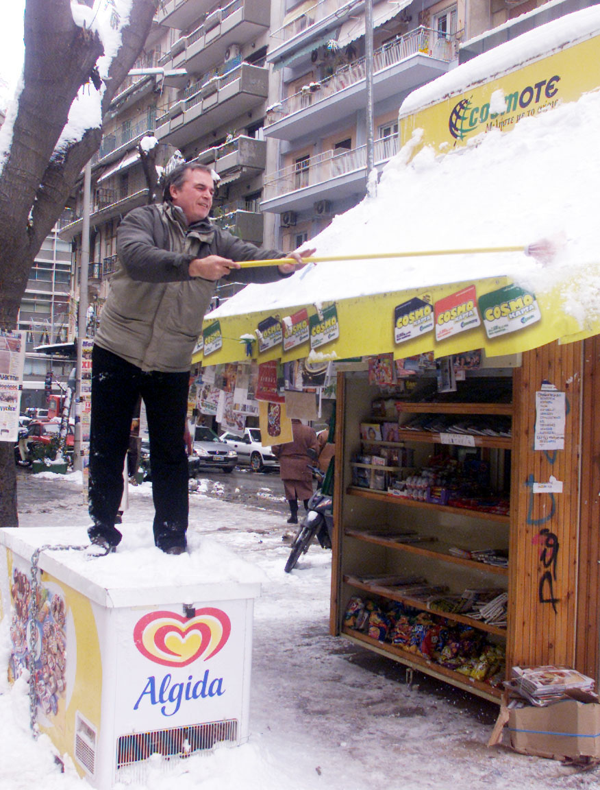 - Στην πλατεία Αριστοτέλους, λίγοι τολμηροί στους πάγκους με τα χριστουγεννιάτικα, φτυαρίζαμε το χιόνι για να στήσουμε, κονιάκ και όλα τα ρούχα φορεμένα, μεροκάματο… Χρήστος Μάρης