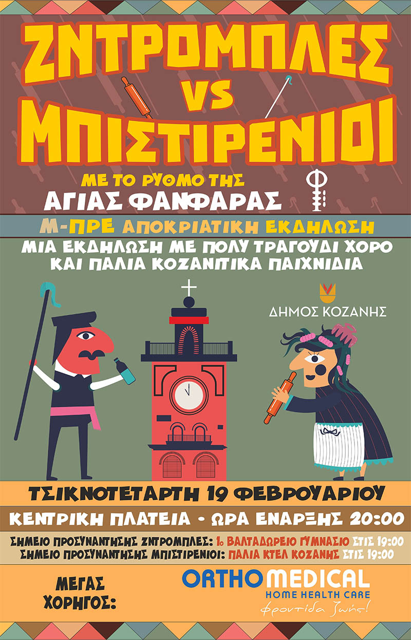 Την Τετάρτη 19 Φεβρουαρίου 2025, Παραμονή Τσικνοπέμπτης, και ώρα 20:00 το βράδυ στην Κεντρική Πλατεία Νίκης, ξεκινούν τα προεόρτια της Αποκριάς της Κοζάνης, με τις ΖΝΤΡΟΜΠΛΕΣ και τους ΜΠΙΣΤΙΡΕΝΙΟΥΣ. Μια εκδήλωση με πολύ τραγούδι, χορό και παλιά Κοζανίτικα παιχνίδια, στους ρυθμούς της Αγίας Φανφάρας.