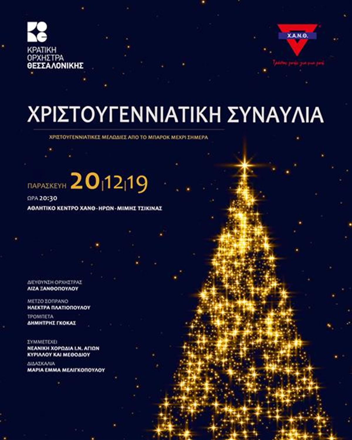 Η καθιερωμένη Χριστουγεννιάτικη συναυλία για τη ΧΑΝΘ φέτος οχτώ χρόνια ζωής. Το πλούσιο φετινό πρόγραμμα περιλαμβάνει γιορτινές Χριστουγεννιάτικες μελωδίες από το μπαρόκ έως και σήμερα. Μαζί με την ΚΟΘ η μέτζο σοπράνο Ηλέκτρα Πλατιοπούλου και ο τρομπετίστας Δημήτρης Γκόγκας, υπό τη μουσική διεύθυνση της Λίζας Ξανθοπούλου. Συμμετέχει η Χορωδία Ιερού Ναού Αγίων Κυρίλλου και Μεθοδίου.