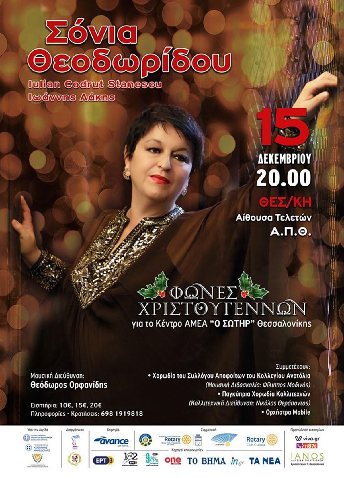 Η Σόνια Θεοδωρίδου τραγουδά τις Φωνές Χριστουγέννων για το Κέντρο ΑΜΕΑ ”Ο ΣΩΤΗΡ ” Με τους Τενόρους Iulian Codrut Stanescu και Ιωάννη Λάκη, την Χορωδία του Συλλόγου Αποφοίτων του Κολλεγίου Ανατόλια, την Παγκύπρια Χορωδία Καλλιτεχνών και την Ορχήστρα Mobile, σε μουσική διεύθυνση Θεόδωρου Ορφανίδη. Μία μεγάλη χριστουγεννιάτικη συναυλία για όλη την οικογένεια. Aπό το “Άγια Νύχτα” και τον John Lennon μέχρι το “Ω Έλατο” και το “Hallelujah”. Ένα μαγευτικό μουσικό οδοιπορικό που θα μας ταξιδέψει σε κόσμους εορταστικούς, με αγαπημένες και αξέχαστες μελωδίες, τραγουδισμένα μοναδικά από την διεθνούς φήμης Σοπράνο Σόνια Θεοδωρίδου.