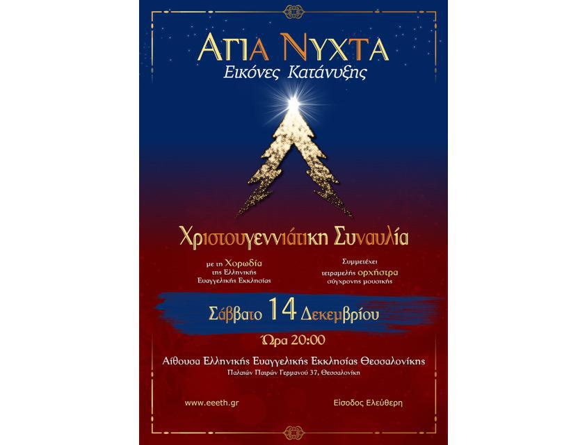Εικόνες κατάνυξης και ζωντάνιας υπόσχεται να ξυπνήσει και φέτος η Χριστουγεννιάτικη Συναυλία της 30μελούς Χορωδίας της Ελληνικής Ευαγγελικής Εκκλησίας, η οποία θα πραγματοποιηθεί το Σάββατο 14 Δεκεμβρίου στις 20:00 στην κεντρική αίθουσα της εκκλησίας. Τη συναυλία παρακολουθούν κάθε χρόνο περίπου 600 θεατές από όλη την Θεσσαλονίκη, οι οποίοι έχουν έτσι την ευκαιρία να απολαύσουν μια σύνθεση παραδοσιακών και σύγχρονων Χριστουγεννιάτικων τραγουδιών, και να γνωρίσουν μία από τις άγνωστες πτυχές της πολυπολιτισμικής ιστορίας της πόλης. Στη φετινή συναυλία, μαζί με την 30μελή χορωδία συμμετέχει η 10μελής παιδική χορωδία της εκκλησίας, καθώς και 4μελής ορχήστρα σύγχρονης μουσικής, υπό την καλλιτεχνική διεύθυνση του Γρηγόρη Δεληγιαννίδη.
