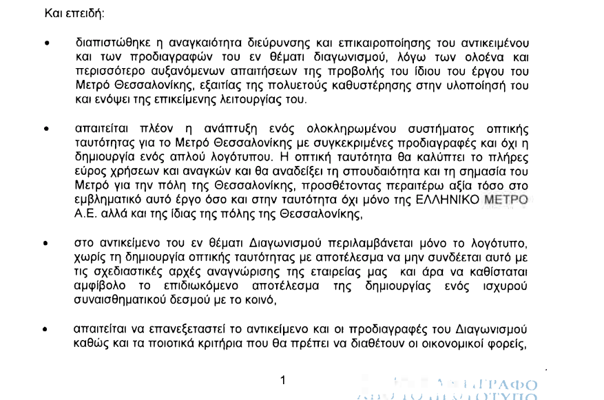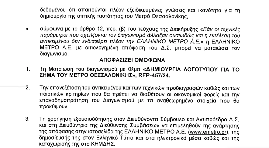 Συγκεκριμένα, ανάμεσα στους λόγους που εξέδωσε το ΔΣ, αναφέρεται ότι “απαιτείται να επανεξεταστεί το αντικείμενο και οι προδιαγραφές του Διαγωνισμού, καθώς και τα ποιοτικά κριτήρια που θα πρέπει να διαθέτουν οι οικονομικοί φορείς, δεδομένου ότι απαιτούνται πλέον εξειδικευμένες γνώσεις και ικανότητα για τη δημιουργία της οπτικής ταυτότητας του Μετρό Θεσσαλονίκης”.