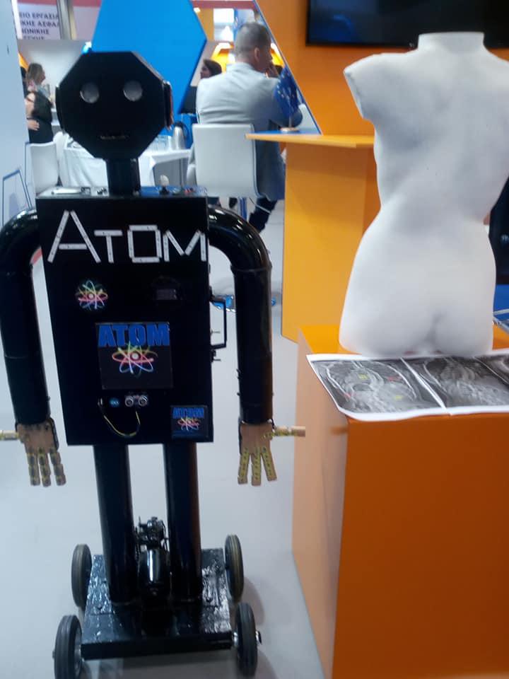 Ο Πρωθυπουργός μιλώντας με τον Παναγιώτη Γιαλαμά μαθητή της Γ Γυμνασίου φέτος στο Γυμνάσιο Κοπάνου, στη Νάουσα, εντυπωσιάστηκε όχι μόνο από τον ATOM (το ρομπότ από τα ανακυκλωμένα υλικά), αλλά και για τη μικρή ηλικία του.