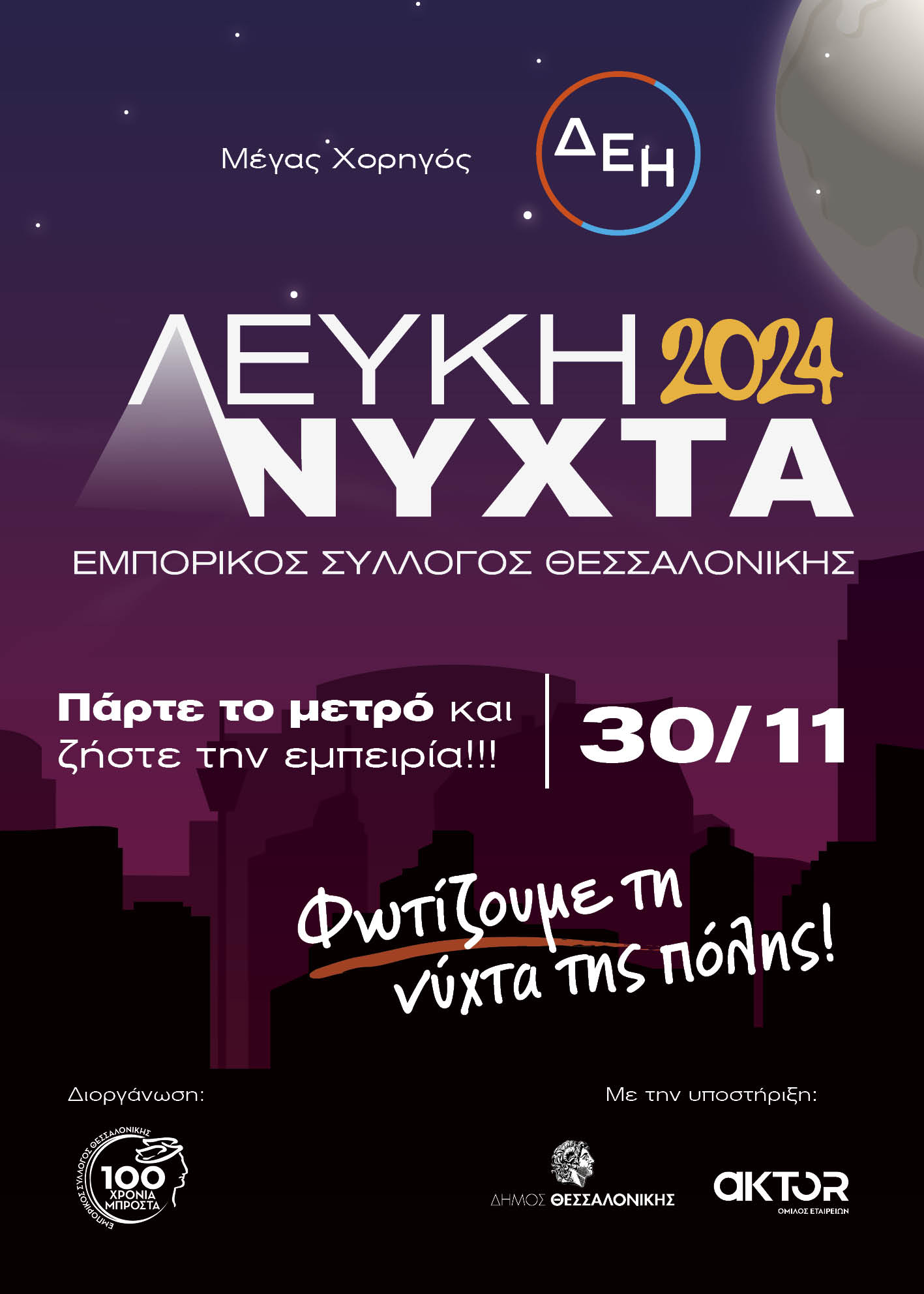 Αφού, την 30η Νοεμβρίου ημέρα Σάββατο όπου θα γίνουν και τα εγκαίνια του Μετρό Θεσσαλονίκης, ο Εμπορικός Σύλλογος της πόλης έχει ανακοινώσει τη διενέργεια Λευκής Νύχτας στα καταστήματα του κέντρου.