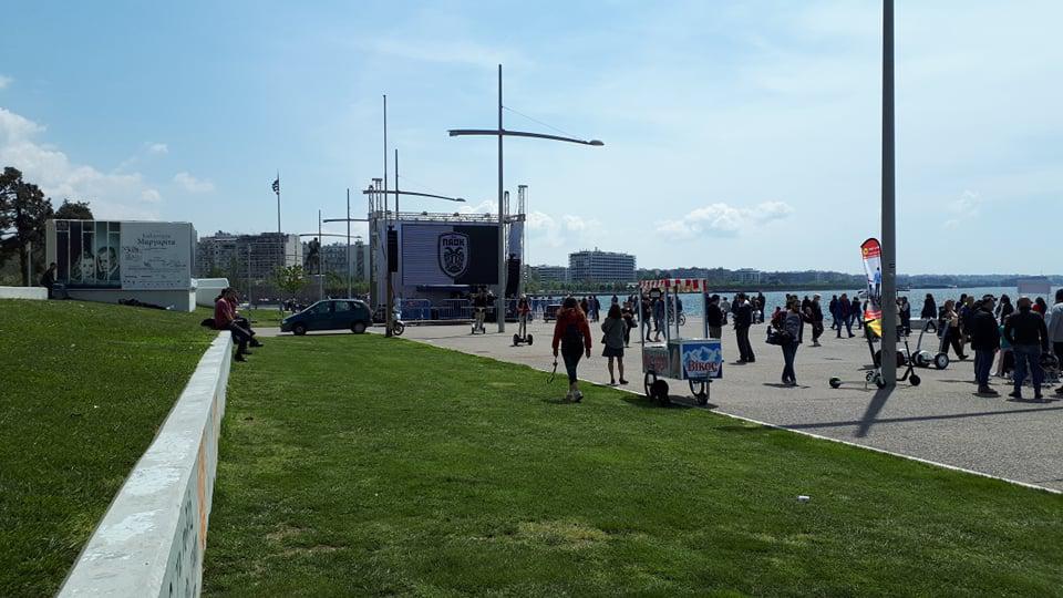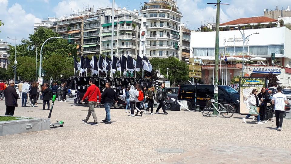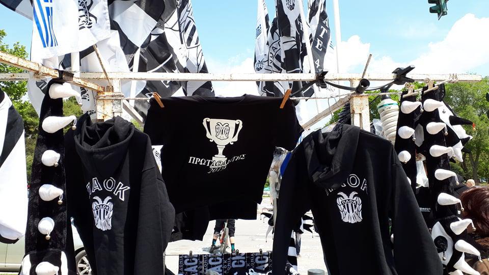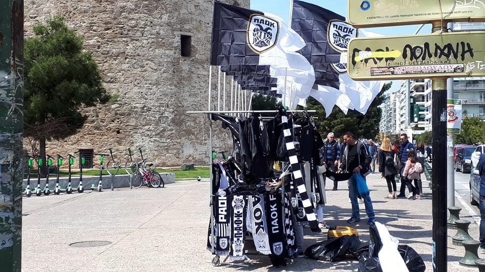 Πάγκοι με σημαίες, μπλούζες, κασκόλ και πολλά ακόμα αντικείμενα έχουν κάνει από νωρίς την εμφάνιση τους γύρω από τον Λευκό Πύργο για την απογευματινή αναμέτρηση, δίνοντας από τώρα έναν πανηγυρικό τόνο.