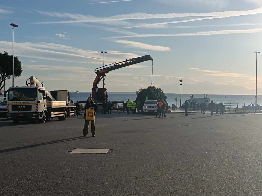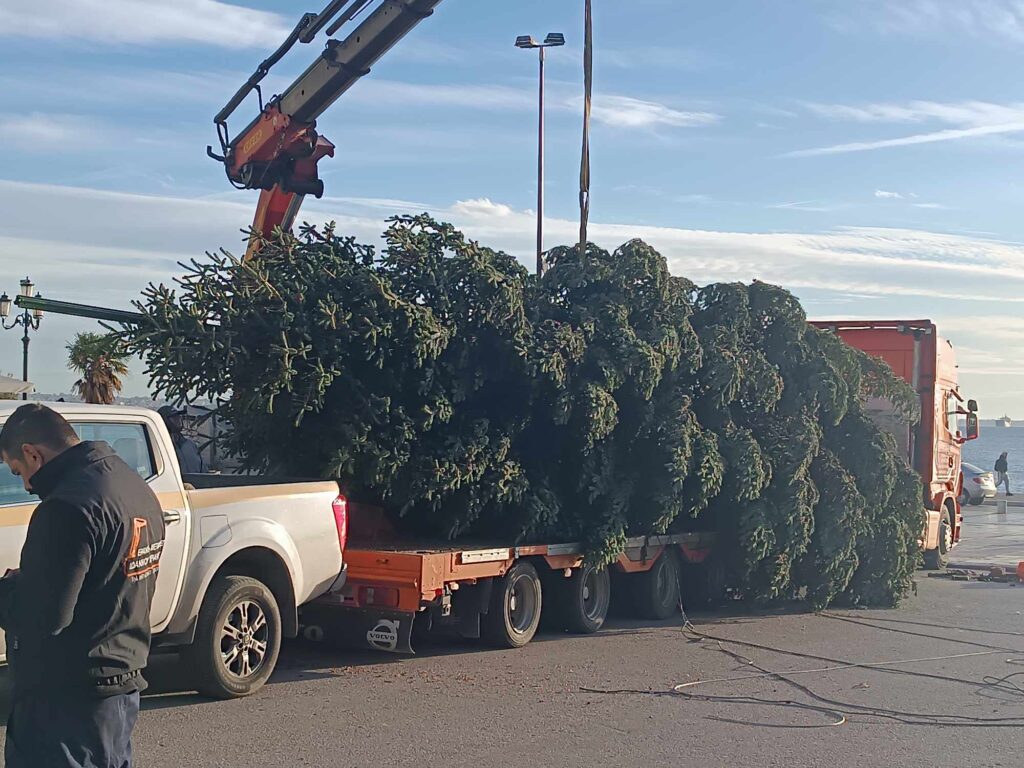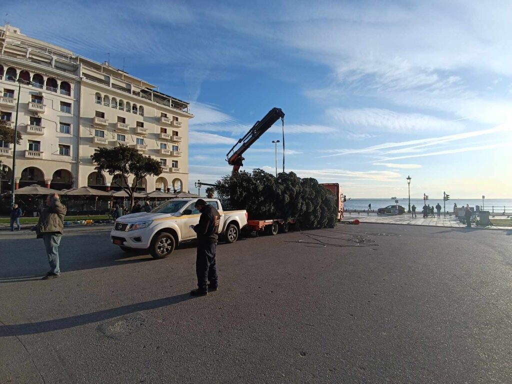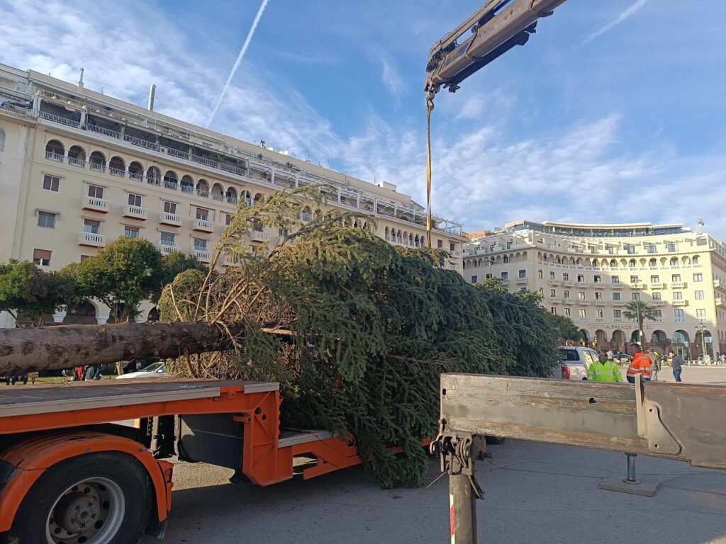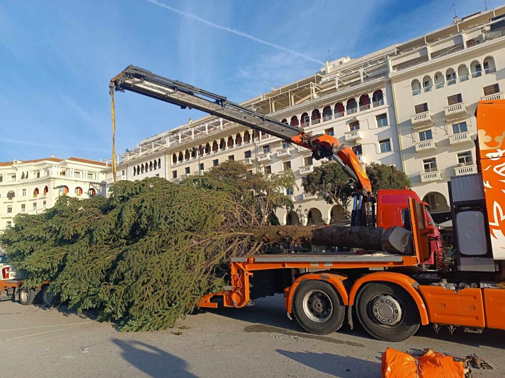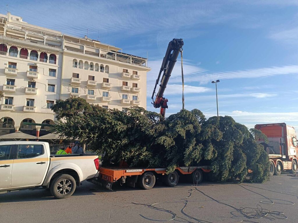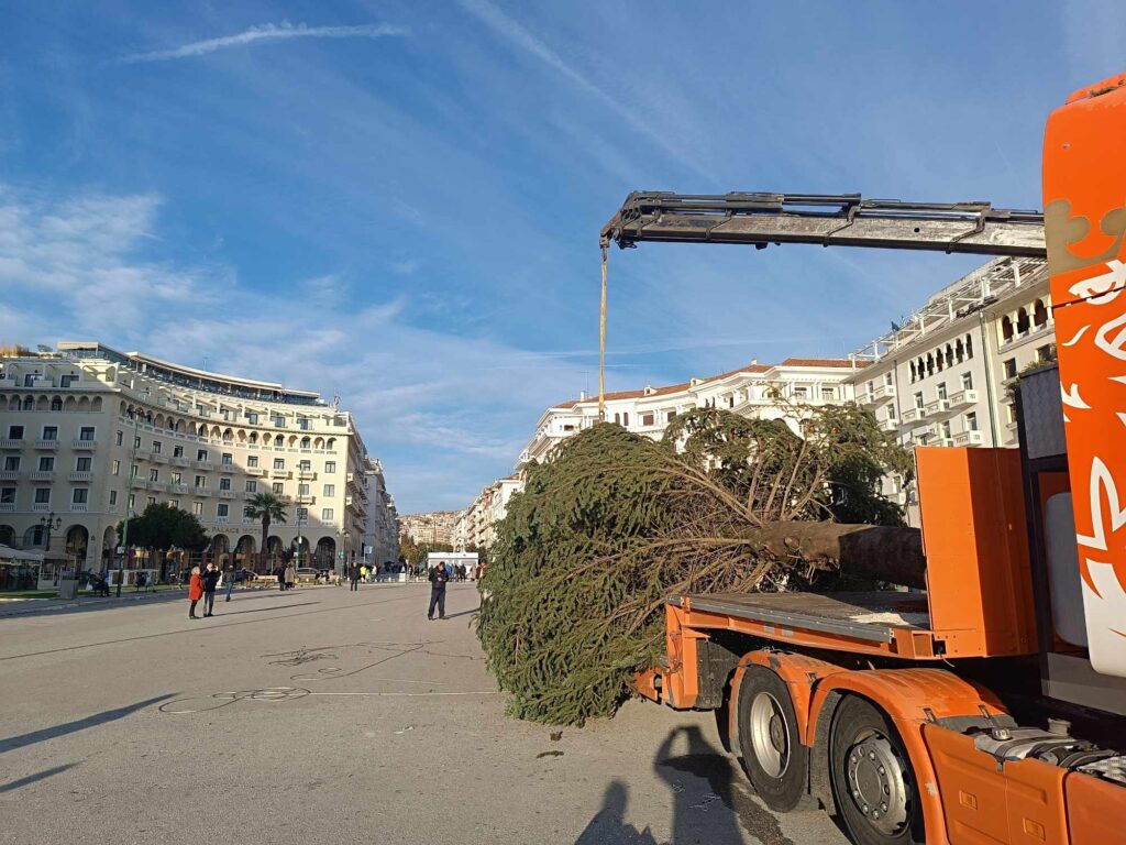 Έφτασε πριν λίγο στην πλατεία Αριστοτέλους το χριστουγεννιάτικο δέντρο που θα κοσμήσει φέτος τα Χριστούγεννα την πλατεία.