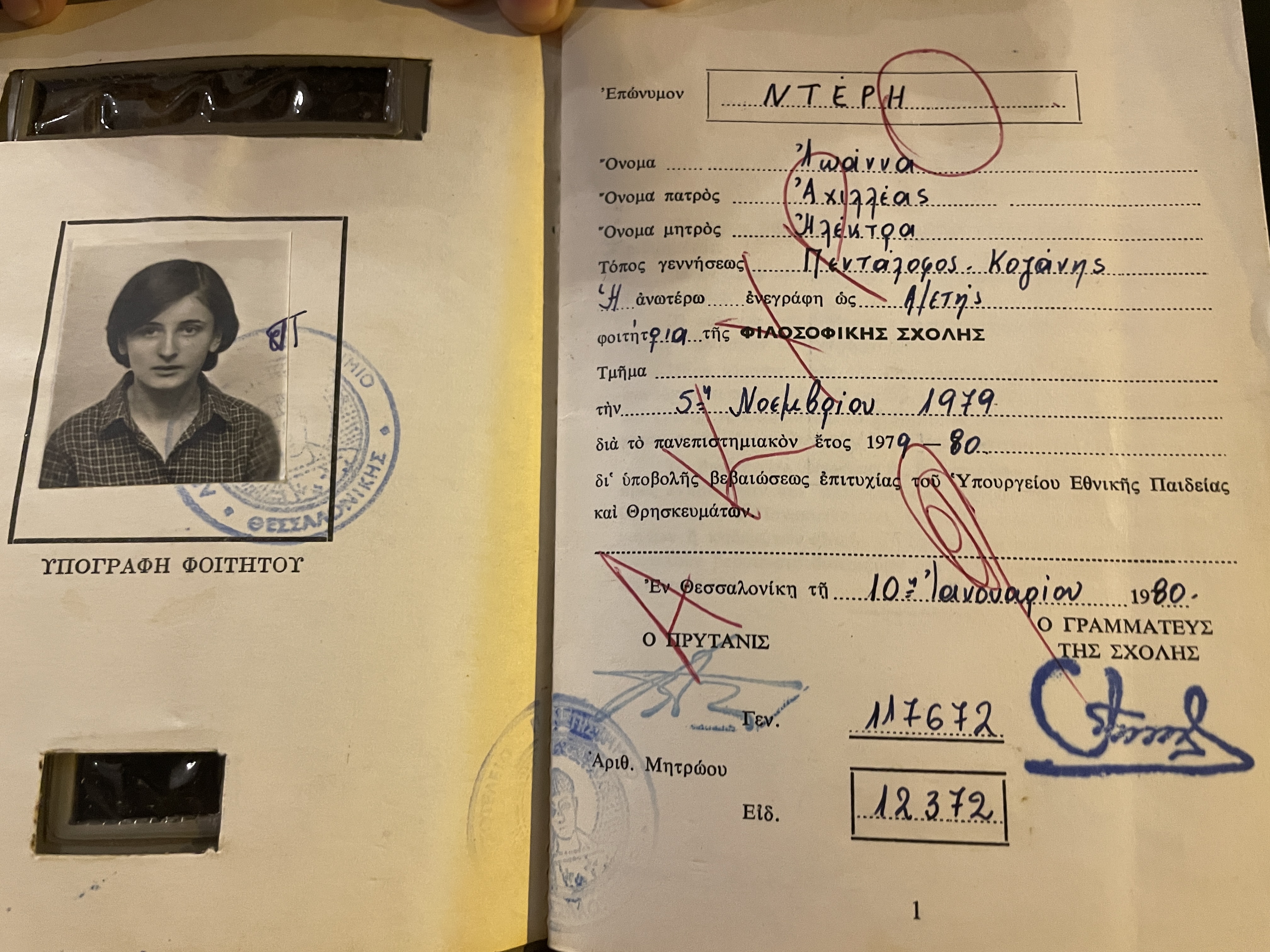 Δίνω εξετάσεις το Σεπτέμβριο του 1979 και περνάω στην Φιλοσοφική Σχολή του Α.Π.Θ. Πρώτο και δεύτερο έτος τα μαθήματα είναι κοινά, στο τρίτο χωριζόμαστε. Ακολουθώ το Παιδιαγωγικό-Ψυχολογικό Τμήμα. Θυμάμαι τους αγώνες που κάναμε, ήμουνα στο προεδρείο του τμήματος, για τη δημιουργία Τμήματος Ψυχολογίας και δε το καταφέρνουμε. Γίνεται στην Αθήνα και την Κρήτη. Με πείραξε τότε πολύ. Καθηγήτρια που διαμόρφωσε το στυλ μου ως καθηγήτριας με τον τρόπο που έκανε το μάθημα, είναι η Μίκα Χαρίτου-Φατούρου.