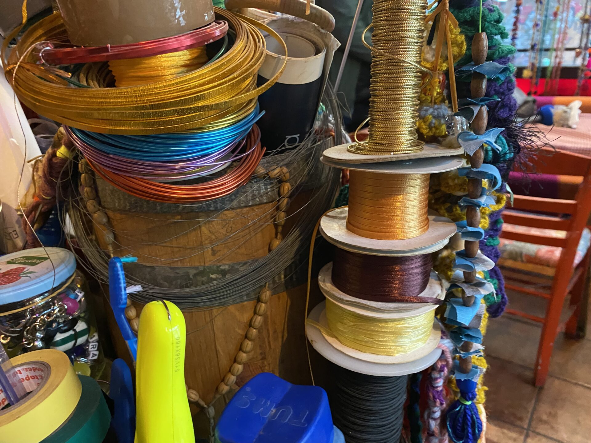 Δημιουργεί τζίβες και φούντες με όλα τα παλιά αντικείμενα που φτάνουν στα χέρια του, όπως επισημαίνει, «με οποιοδήποτε υλικό, όπως ύφασμα, παλιά παπούτσια, παλιές κορδέλες, χάντρες -πήγα μέχρι και στο Χονγκ Κονγκ και βρήκα περίπου 4.000 χάντρες- αλλά και ρούχα που μου φέρνουν από ανθρώπους που έχουν φύγει από τη ζωή και θέλουν να τους θυμούνται με ένα αντικείμενο. Τα συνθέτω στο μυαλό, βλέπω τα χρώματα, τα συνδυάζω με διακοσμητικά αντικείμενα, πήρα και τσιγκελάκι από εκεί που αγοράζω κλωστές, έκανα μαθήματα και σχεδόν τέσσερις δεκαετίες τώρα δημιουργώ αντικείμενα μεγάλης συναισθηματικής αξίας, που χαρίζω στον κόσμο».
