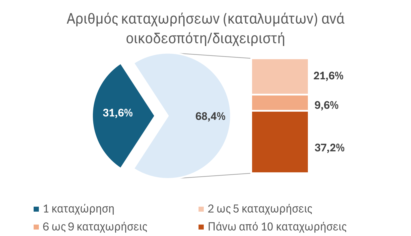 Συγκεκριμένα το 2018 μόλις το 40% των καταχωρίσεων ανήκαν σε διαχειριστές με περισσότερα από ένα ακίνητα (και με πολύ μικρότερο μέσο αριθμό καταχωρίσεων ανά διαχειριστή), ενώ το 60% των καταχωρίσεων αφορούσαν διαχειριστές με ένα μόνο κατάλυμα.