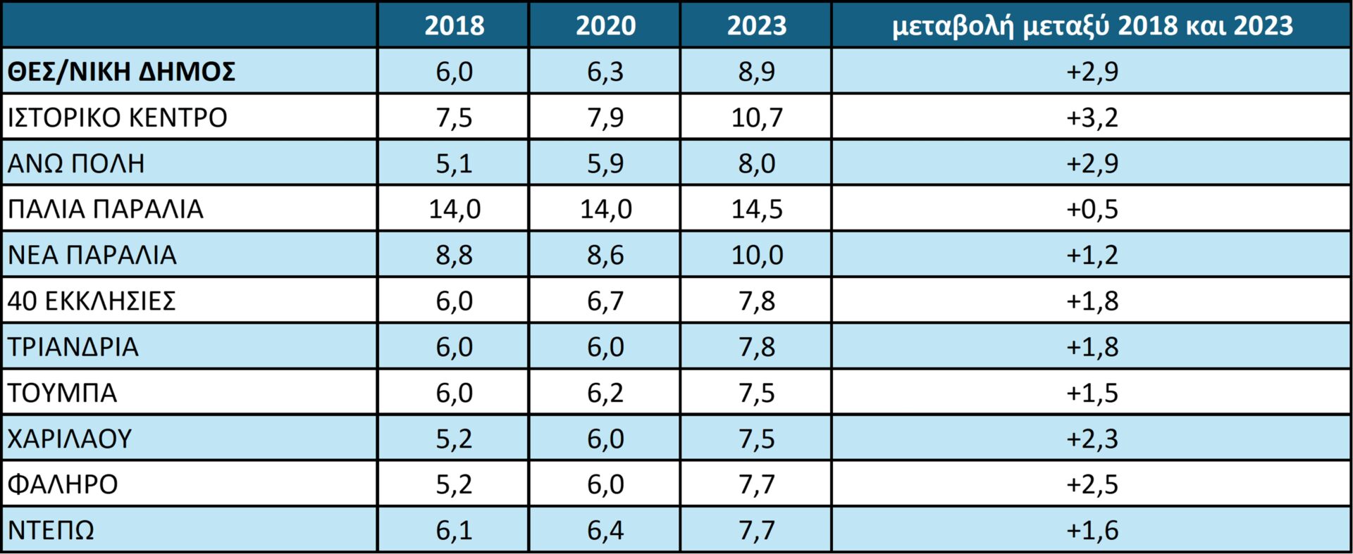 Η εικόνα αυτή, δεν πρέπει ωστόσο να παραξενεύει τους κατοίκους της Θεσσαλονίκης, οι οποίοι γίνονται μάρτυρες μιας ταχύτατης και μεγάλης κλίμακας αλλαγής χρήσης, η οποία μετατρέπει το κέντρο της πόλης σε έναν ανοικτό τουριστικό χώρο με σημαντικές επιπτώσεις στους κατοίκους: (α) μείωση των διαθέσιμων ακινήτων για μακροχρόνια μίσθωση με αύξηση των τιμών των ενοικίων, (β) μείωση του ποσοστού ιδιοκατοίκησης, (γ) μετακίνηση κατοίκων εκτός κέντρου – gentrification/εξευγενισμός, (δ) πίεση στις υπηρεσίες του Δήμου και ειδικά στην καθαριότητα (ε) πίεση στις θέσεις στάθμευσης και στις δημόσιες συγκοινωνίες, (στ) αυξημένος θόρυβος και όχληση στους μόνιμους κατοίκους. Δεν μοιάζει να είναι τυχαίο το γεγονός ότι, οι μεγαλύτερες αυξήσεις σε απόλυτες τιμές (€/τ.μ.) των ενοικίων εντοπίζονται στις περιοχές που παρατηρείται και εντονότερη χωρική παρουσία της βραχυχρόνιας μίσθωσης: Ιστορικό κέντρο, Άνω πόλη, Φάληρο.