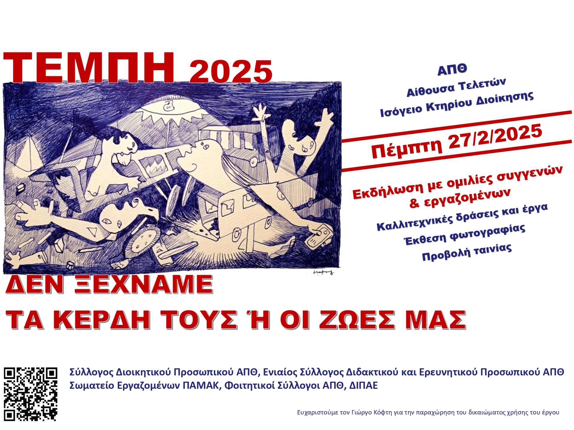 Με αφορμή τη θλιβερή επέτειο, σύλλογοι εργαζομένων, φοιτητών και διδασκόντων των Πανεπιστημίων, εργατικά σωματεία της πόλης σας καλούν σε μία σειρά εκδηλώσεων για όλη τη διάρκεια της ημέρας την Πέμπτη 27/2/2025, για τους συνανθρώπους μας που χάθηκαν στα Τέμπη. Οι εκδηλώσεις θα ξεκινήσουν στις 10:00 π.μ. το πρωί της 27ης Φεβρουαρίου 2025 στο Ισόγειο του Κτιρίου Διοίκησης και στην Αίθουσα Τελετών του ΑΠΘ. Θα περιλαμβάνουν εκδήλωση με ομιλίες από συγγενείς θυμάτων, εργαζόμενους στον Σιδηρόδρομο και μέλη της Ακαδημαϊκής Κοινότητας, που θα κλείσει μουσικά με έργα για πιάνο και βιολί – προβολή ταινίας – έκθεση φωτογραφίας – εργαστήρια και καλλιτεχνικές δράσεις με έργα από μέλη του ΑΠΘ.