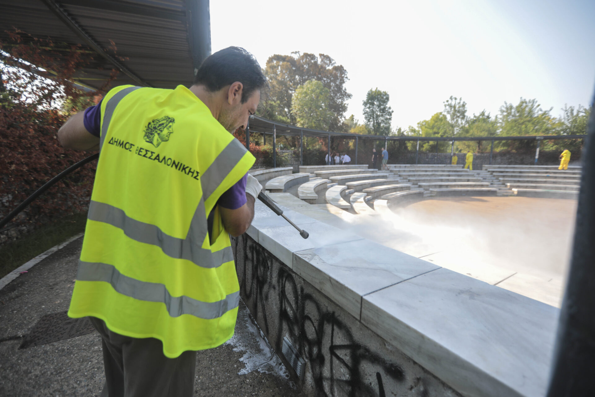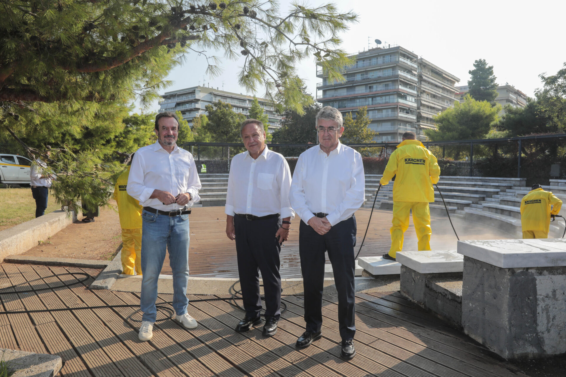 Τις εργασίες που πραγματοποιούνται με την έμπρακτη υποστήριξη της εταιρείας Kärcher επιθεώρησαν ο Δήμαρχος Θεσσαλονίκης Στέλιος Αγγελούδης και ο Πρόεδρος της Πολιτιστικής Εταιρείας Σταύρος Ανδρεάδης.