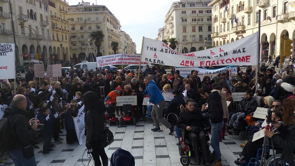 Συλλαλητήριο ατόμων με αναπηρίες, με αιτήματα ποιοτικές υπηρεσίες πρωτοβάθμιας φροντίδας και περίθαλψης για τους αναπήρους, “ισότιμη” πρόσβαση τους στην υγεία και στην παιδεία και ενίσχυση στην εκπαίδευσης και τις δημόσιες πολιτικές για τα ΑμεΑ, πραγματοποιήθηκε στο άγαλμα του Ελ. Βενιζέλου, στο κέντρο της Θεσσαλονίκης.