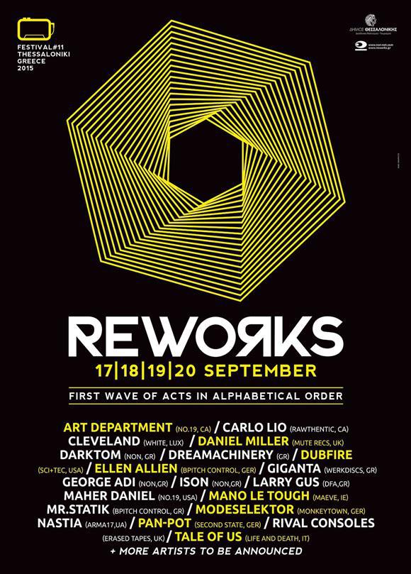 Και αυτόν τον Σεπτέµβρη η Θεσσαλονίκη πάει Reworks, το οποίο φέρνει έργα καταξιωµένων σε παγκόσµιο επίπεδο καλλιτεχνών, νέες µουσικές τάσεις από ανερχόµενα ονόµατα, αλλά και εγχώριους καλλιτέχνες. Μέχρι σήµερα το Διεθνές Μουσικό Φεστιβάλ Reworks έχει φιλοξενήσει το έργο περισσότερων από 850 καλλιτεχνών και σχηµάτων και συνεχίζει ακάθεκτο, µε την 11η έκδοση του να διαρκεί 4 ηµέρες, από τις 17-20 Σεπτεµβρίου 2015. Οι Tale of Us, o Dubfire, οι Modeselektor, η Ellen Allien, οι Pan-Pot και ο Art Department θα είναι κοντά µας, ενώ θα παρουσιαστούν επίσης καλλιτέχνες που έρχονται για πρώτη φορά στην Ελλάδα και τη Θεσσαλονίκη, καθώς και ένα πλούσιο πρόγραµµα Ελλήνων δηµιουργών και καλλιτεχνών. Το φεστιβάλ προσδοκά να καταστήσει τη Θεσσαλονίκη για µια ακόµη χρονιά σηµείο συνάντησης των φίλων της µουσικής από όλη την χώρα και το εξωτερικό. Με µήνυµα του για άλλη µια χρονιά το «we define our future», καλεί το κοινό να αντιπαρατεθεί στις δύσκολες καταστάσεις της εποχής και προσκαλεί τους καλλιτέχνες από την Ελλάδα και το εξωτερικό, να «ορίσουν» το δικό τους µέλλον χωρίς αδράνεια και στασιµότητα.