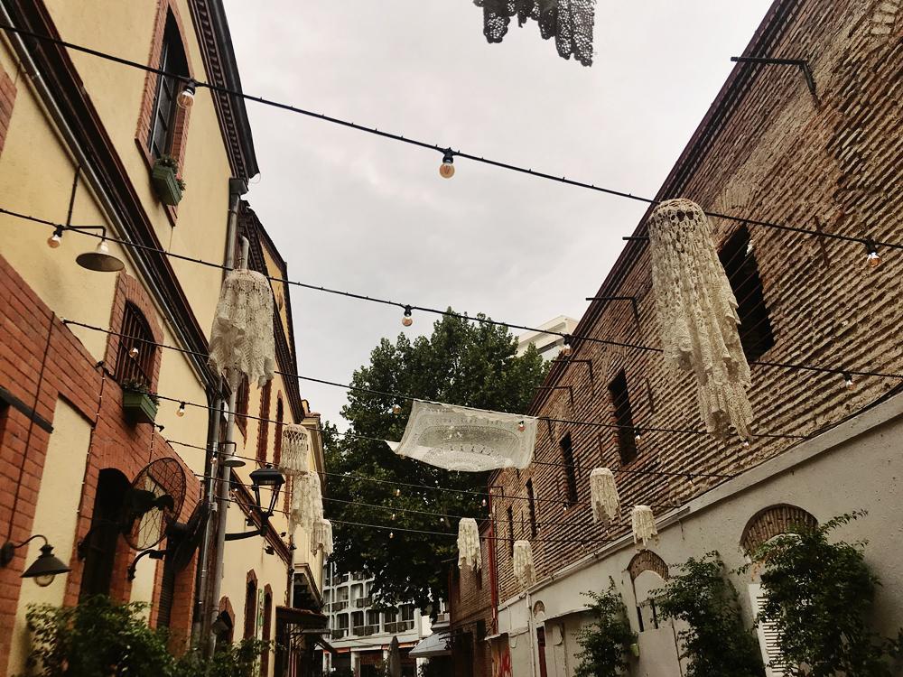 Η πιο εντυπωσιακή τους χρήση σε εξωτερικό χώρο βρίσκεται στην οδό Περιστερίου, ένα από τα μικρά γραφικά καλντερίμια στα Λαδάδικα, όπου μια σύνθεση από φωτιστικά έχει ντυθεί με μεγάλα περίτεχνα κεντημένα σεμέ, δημιουργώντας έναν ουρανό με στοιχεία από τα παιδικά μας χρόνια και τα όνειρα της γιαγιάς.