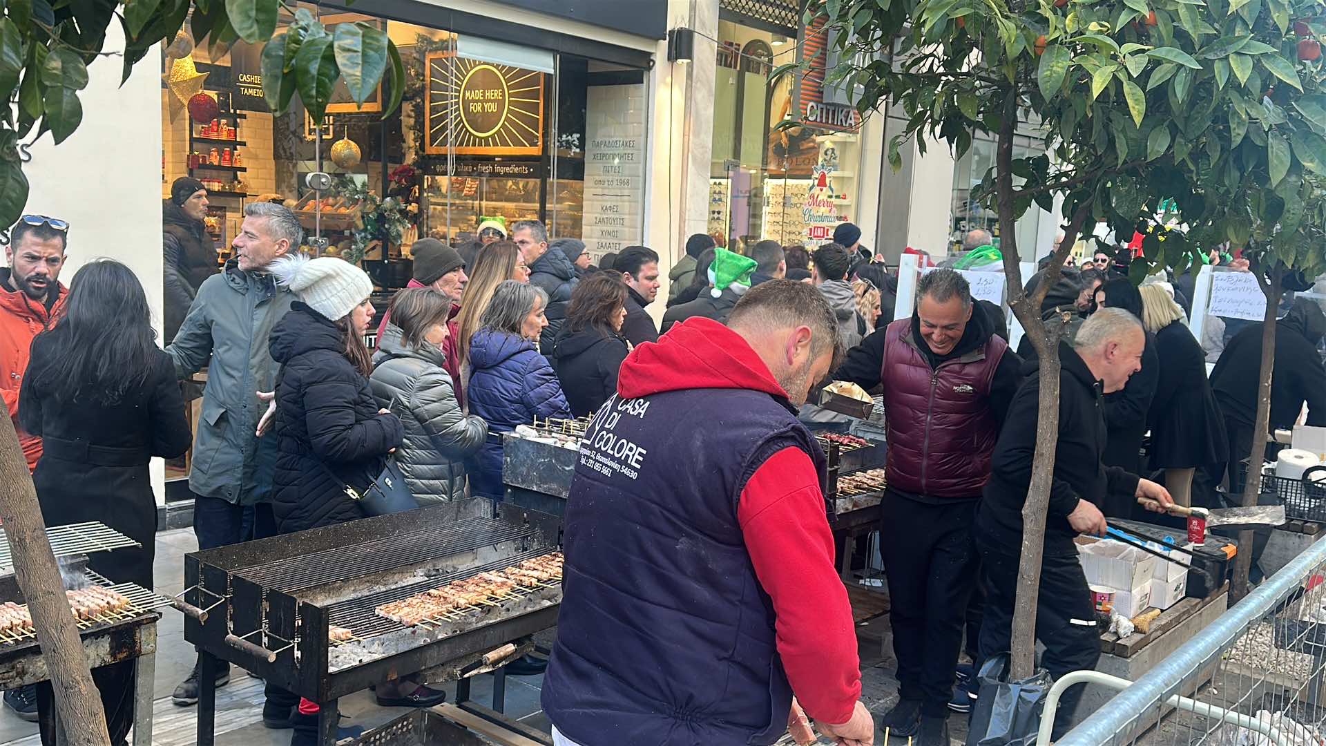 Η ώρα μετρά αντίστροφα για την υποδοχή της νέας χρονιάς και στην οδό Βασιλέως Ηρακλείου, στο κέντρο της Θεσσαλονίκης, η ατμόσφαιρα είναι ζεστή με σουβλάκια, αλκοόλ και μουσική, παρά το… τσουχτερό κρύο.