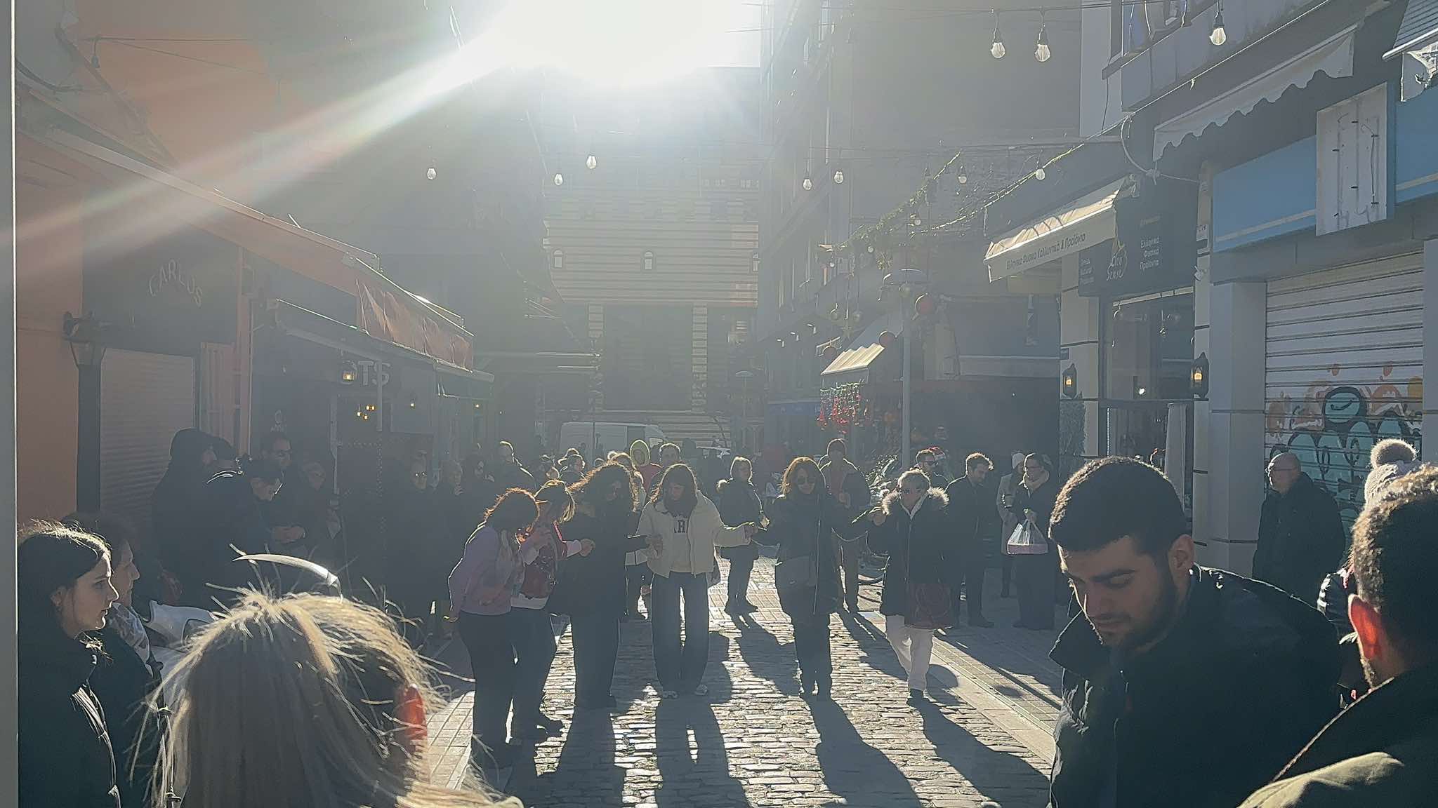 Η γιορτινή διάθεση έχει εξαπλωθεί σε κάθε γωνιά της πόλης, με μικρά συγκροτήματα να παίζουν ζωντανά μουσική σε δρόμους και πλατείες, ενώ οι περαστικοί απολαμβάνουν τη βόλτα τους και τη γιορτινή ατμόσφαιρα.